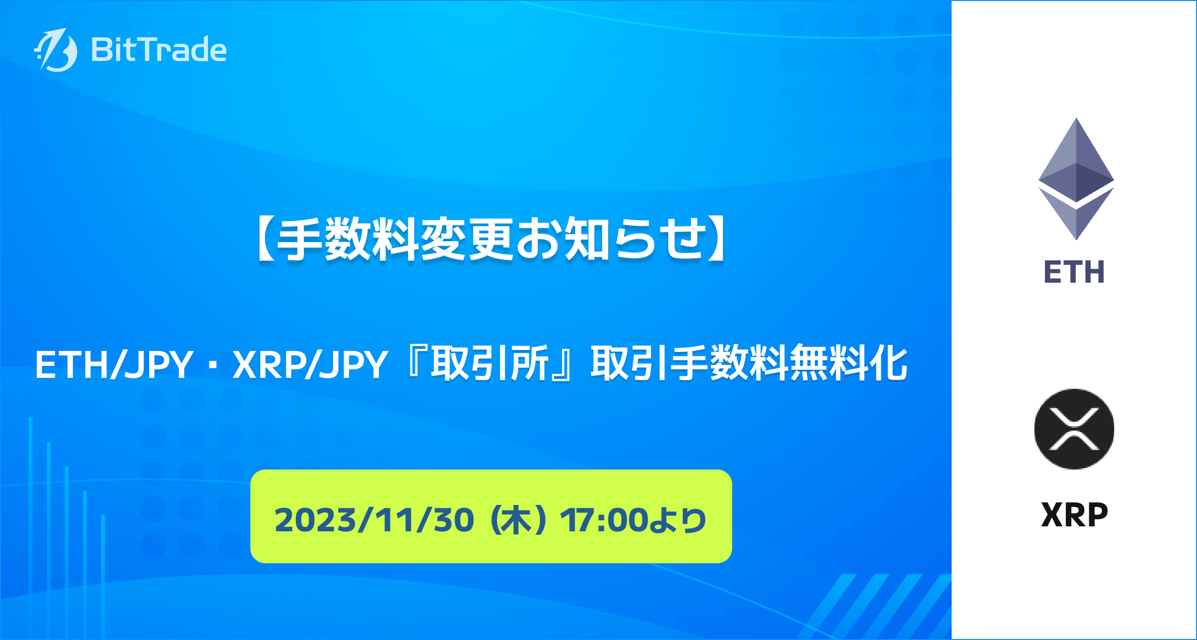 2023/11/30 17:00より取引所におけるETH/JPY(イーサリアム/日本円)、XRP/JPY(エックスアールピー・リップル/日本円)の取引手数料を無料にします。