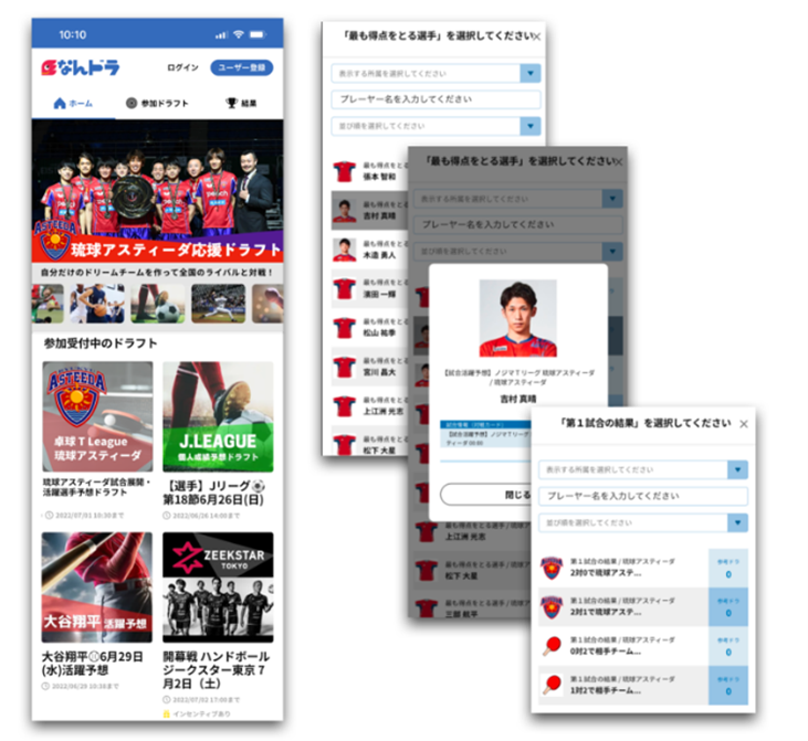 ファンタジースポーツとは、自分がプロスポーツチームの監督やゼネラルマネージャーになったつもりで一定のルールの下に実在する好きな選手を集めて「空想の最強チーム(ファンタジーチーム)」をつくり、実際の選手の成績をポイント化して総合ポイント等を競うオンラインスポーツシミュレーションゲームのこと。その国内向けサービスのひとつである「なんドラ」では、スポーツ・エンタメ・社会・文化など幅広いジャンルを対象に、イベントの中で誰が活躍するかを予想し、自分だけのオールスターチームをつくります。 そして実際に行われるイベントでの各選手の活躍を独自の指標により数値化し、獲得合計ポイントで対戦する新感覚サービスとなっています。卓球Tリーグチームでは琉球アスティーダの「ファンタジースポーツ」導入が初の事例となります。