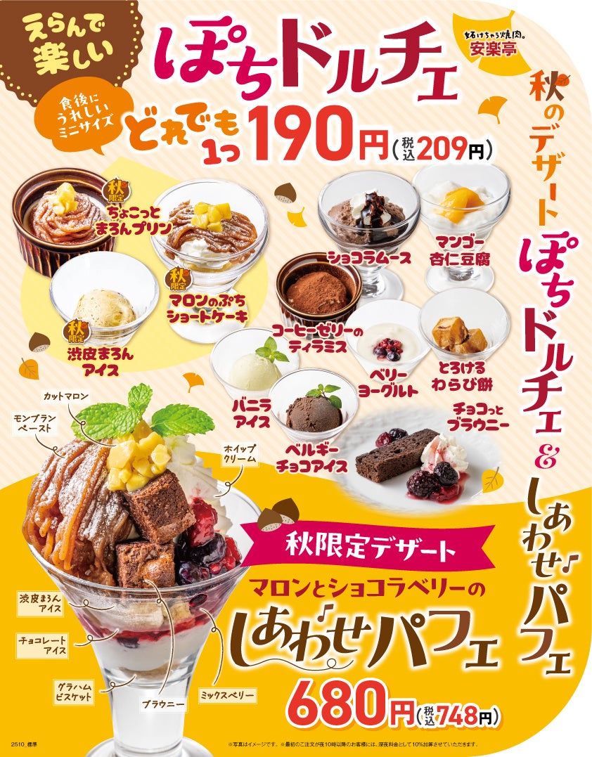【安楽亭でほっこり、しあわせ】10月8日~栗のやさしい甘みと秋の彩りを楽しむひととき♪季節限定パフェとぽちドルチェ3種が秋風に誘われて新登場!マロンパフェ&ぽちドルチェでしあわせスイーツタイムを!