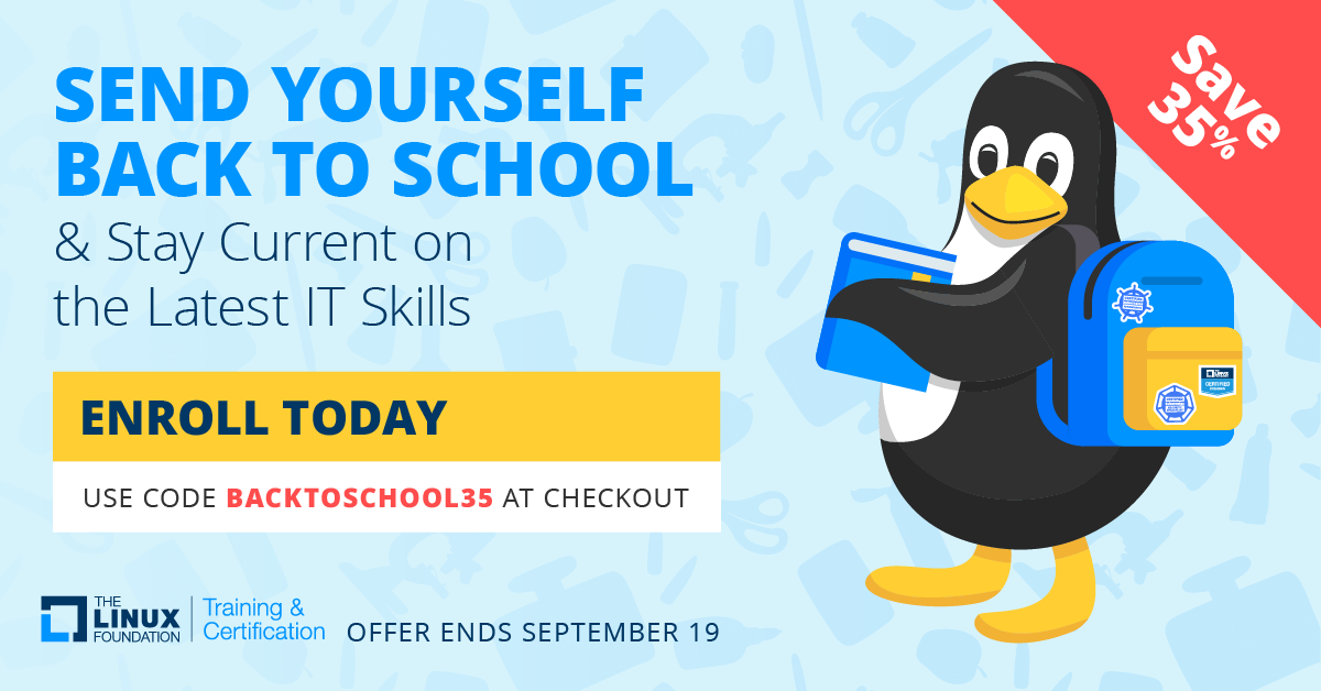 ITプロフェッショナルにとって、スキルを最新に保つことは仕事をする上で不可欠です。子供たちが学校に戻るこの季節に、Linux Foundationは、幅広いIT分野のオンラインコースと認定試験を35%割引で提供し、学習の機会を後押しします。Linux Foundationの100以上のオンラインコースと認定試験、バンドル、ブートキャンプが対象です : https://training.linuxfoundation.org/ja/full-catalog/?trp-form-language=ja