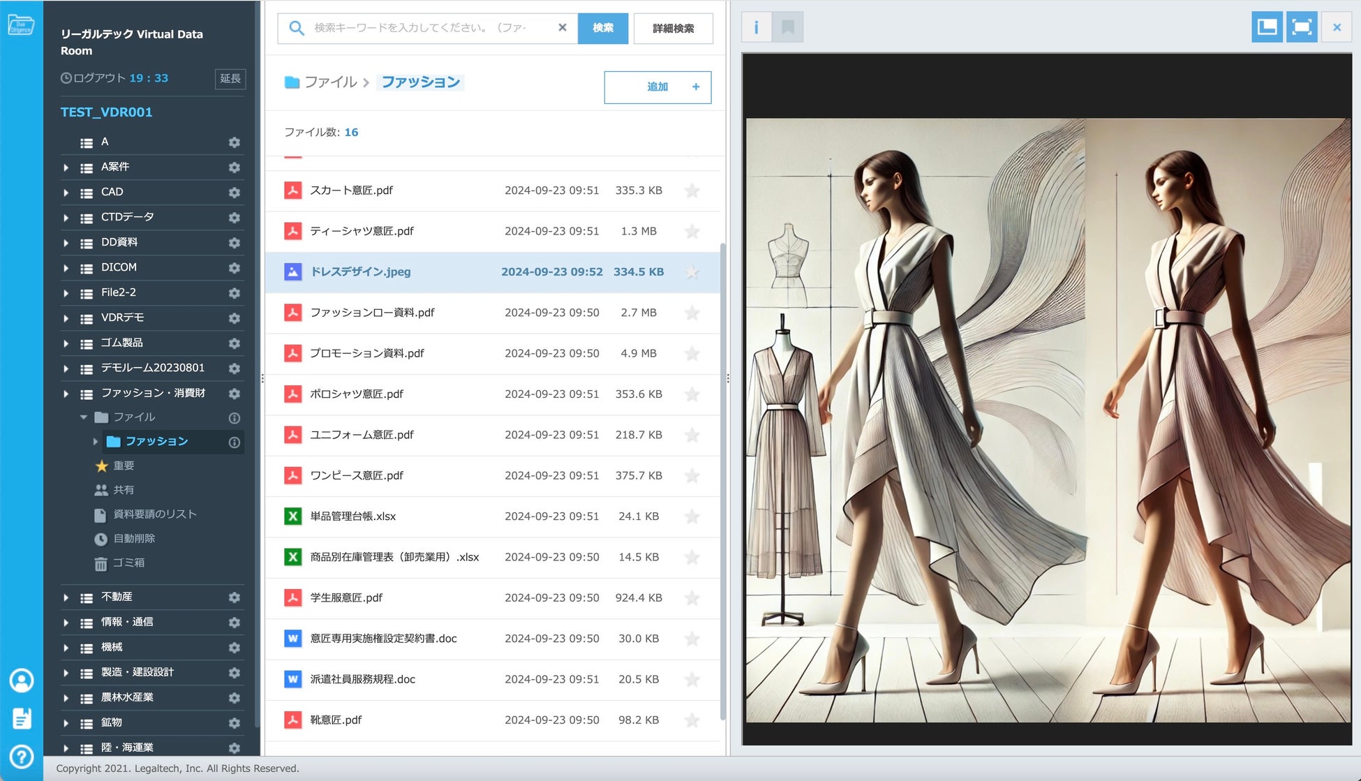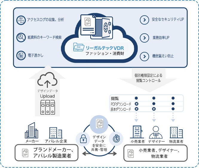 「リーガルテックVDR ファッション・消費財」は、業界が直面するこれらの課題を解決するために開発されました。高いセキュリティ基準を備え、設計データや新商品の仕様書をパートナー企業と安全に共有できる環境を提供します。さらに、デザイン素材や商品のライフサイクル全体にわたり、データの可視化とアクセス制御が可能です。