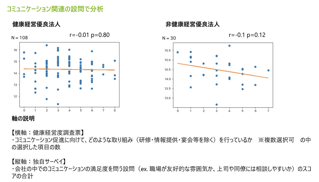 - コミュニケーション促進に向けての企業サイドの取り組みと従業員の会社の中でのコミュニケーションに関する満足度について分析した結果、非健康経営優良法人のみ施策数と従業員満足度との間に統計的に有意とまでは言えないが、負の相関が見られた
