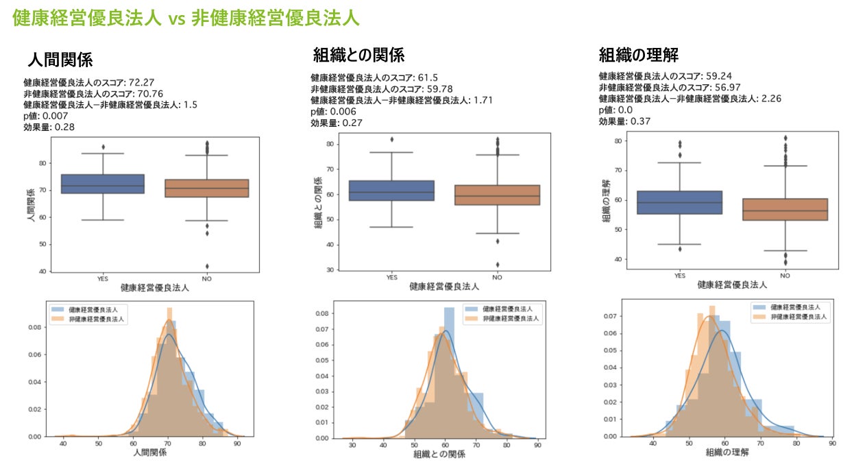 - 健康経営優良法人か否かの2群で分析した結果、全ての項目に対して健康経営優良法人の方がスコアが高い