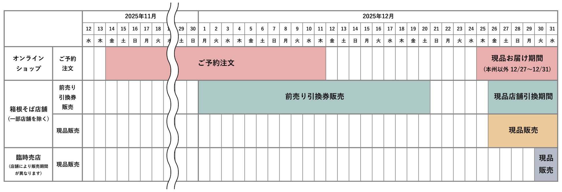 年越そばのオンライン予約(配送分)は、2025年11月14日(金)から12月11日(木)まで承ります。商品は12月25日(木)から31日(水)のご希望日時に配送※1・2いたします。