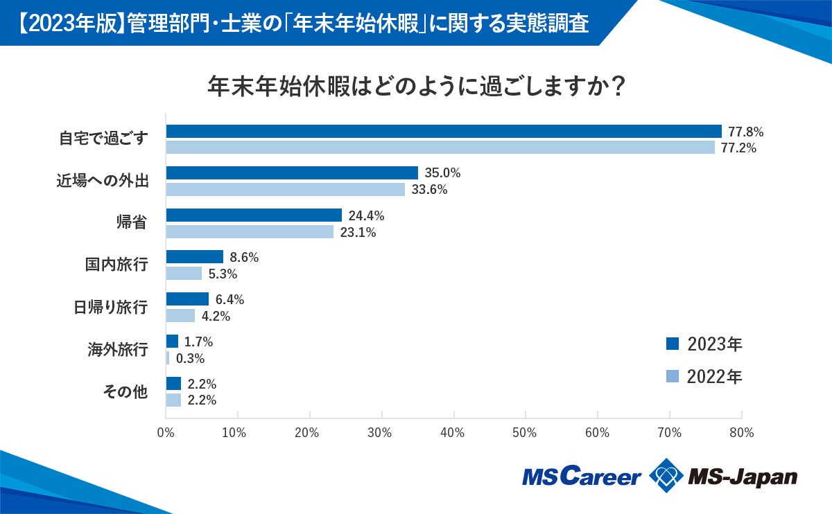 また、コロナが5類に移行して初めての年末となるため、「国内旅行」「日帰り旅行」「海外旅行」の割合も2022年より増加しています。