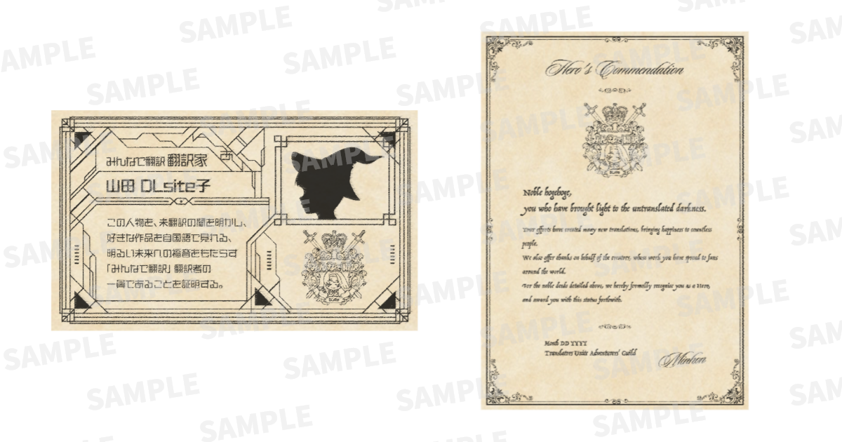 翻訳者を「作品の持つ可能性を信じて未知の世界への道を切り拓いていく勇者」に見立て、その冒険の道のりを応援する取り組みとして、ミッションクリアに応じたクーポンやDLsiteで利用できるポイントといった使える特典ほか、多くの作品翻訳を手掛けた方を讃える羊皮紙で作った「英雄証明書」、豪華な記念盾など活躍を讃えるリアルアイテムも贈呈予定です。