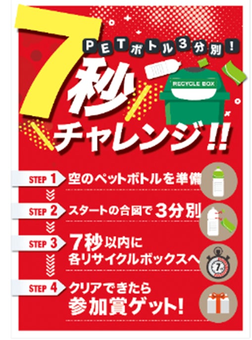 このイベントでは、参加者がペットボトルの水平リサイクルに必要な3つの分別作業を7秒以内で完了することにチャレンジします。チャレンジに成功した方は、関西国際空港のオリジナルグッズなどの景品が当たる「キャップコインガチャ」を回すことができます。