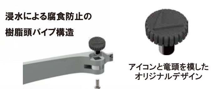 フロントとテンプルを繋ぐ丁番には、通常のネジのみではなく、運動などによる汗や水の浸水による腐食防止の樹脂頭パイプ構造で錆びにくくなりました。これによりネジ頭が壊れることによる調整できないトラブルを解消しました。