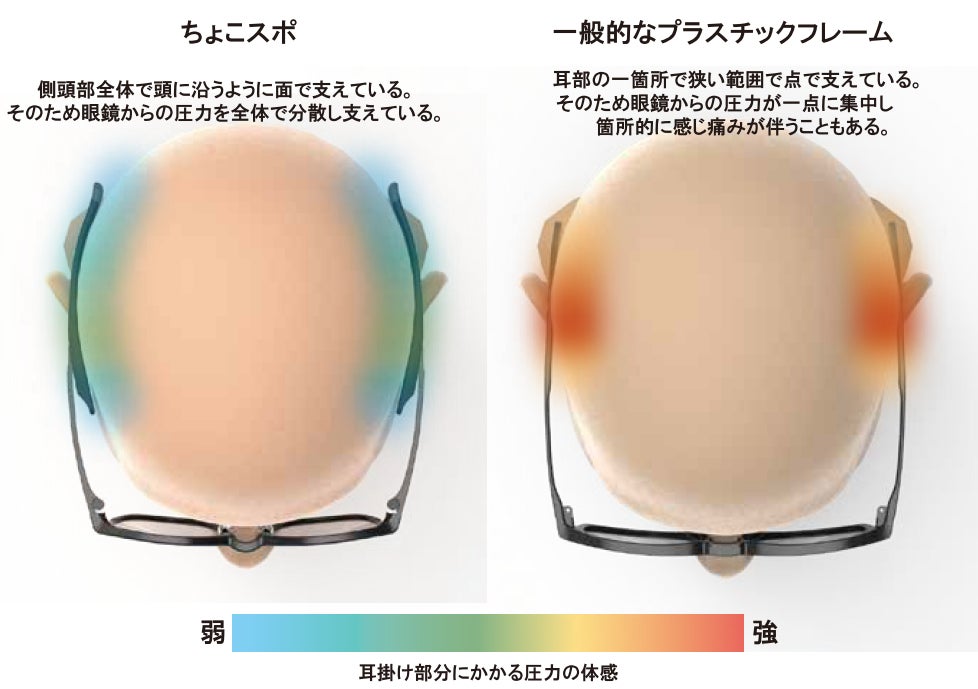 またテンプルには耐圧分散機能のある仕様を施し、こめかみの圧迫感を軽減します。