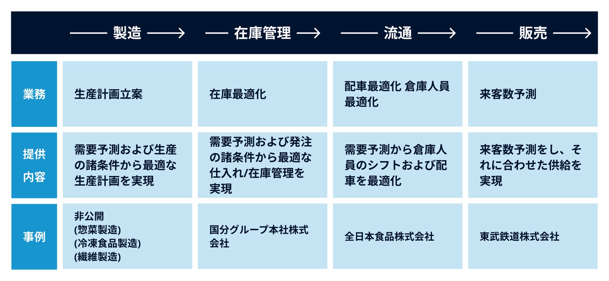 AI需要予測モデルと最適化条件をかけ合わせ、さらに貴社向けにモデルをチューニングし最適な結果を算出します。予測業務効率化・属人化の排除、自動発注・在庫最適化、配送最適化、倉庫シフト最適化、生産最適化など各業務を最適化します。