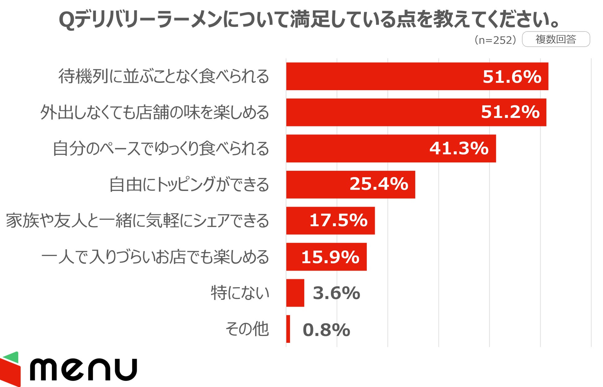 デリバリーラーメンに満足している点については、 「並ぶことなく食べられる」(51.6%)、「外出しなくてもお店の味が楽しめる」(51.2%)といった利便性が共に過半数の支持を集めています。その他、自分のペースで気兼ねなく食べられたり、自由にトッピングできる点も支持されています。