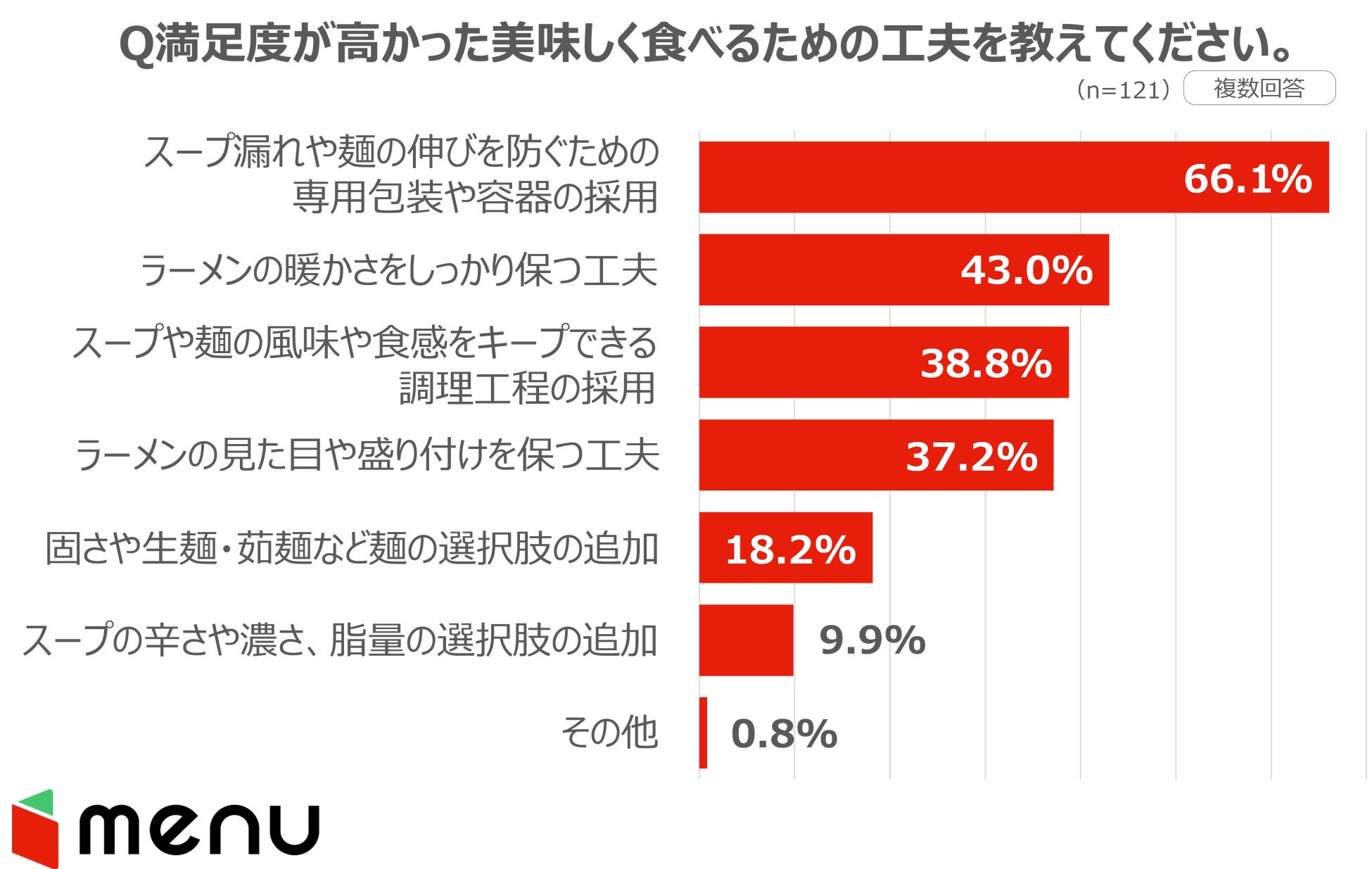 満足度が高かった美味しく食べるための工夫について聞いてみると、「スープ漏れや麺の伸びを防ぐ専用包装・容器」(66.1%)が最も多く、次いで「ラーメンの暖かさを保つ工夫」(43.0%)などが評価されており、店舗の努力がデリバリーラーメンの高い満足度の秘訣となりそうです。