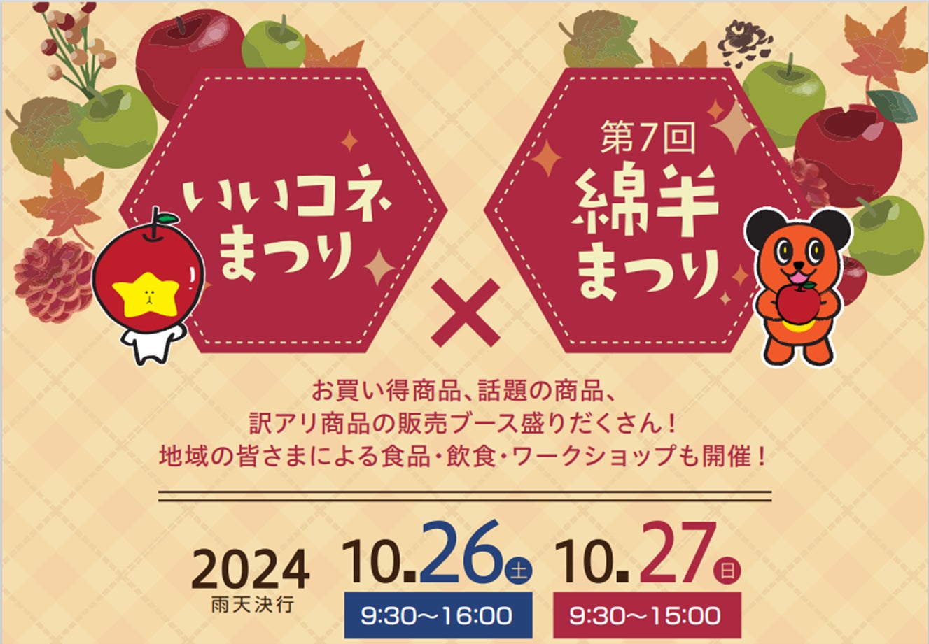 株式会社綿半インテック(本社:長野県飯田市北方1023-1 代表取締役社長 笹 広男)は、いいづなコネクトEAST(旧飯綱町立三水第二小学校)にて、2024年10月26日(土)、27日(日)の2日間に渡って「いいコネまつり×第7回綿半まつり」を開催いたします。