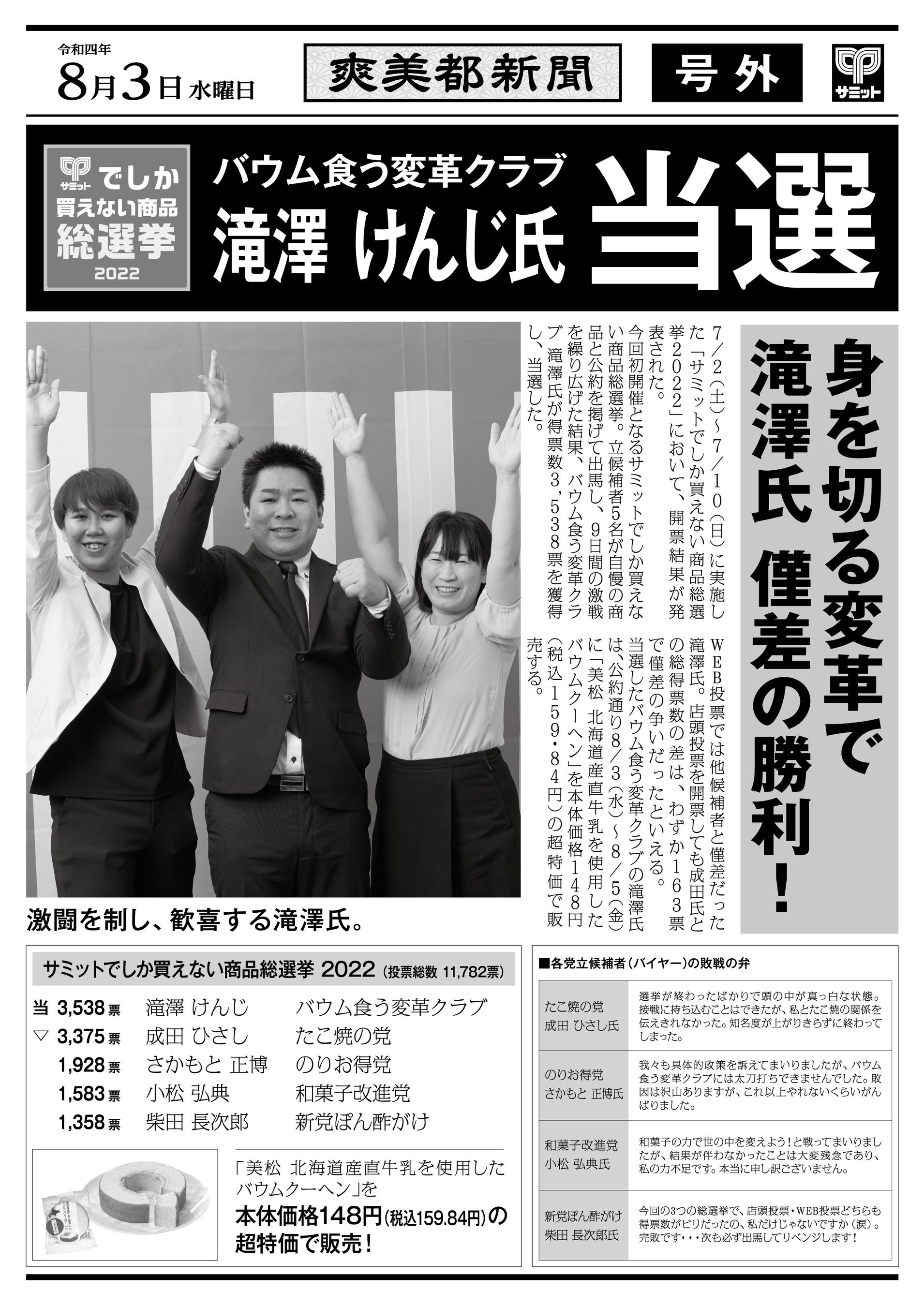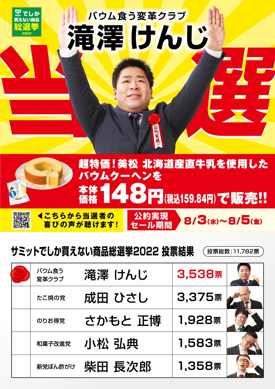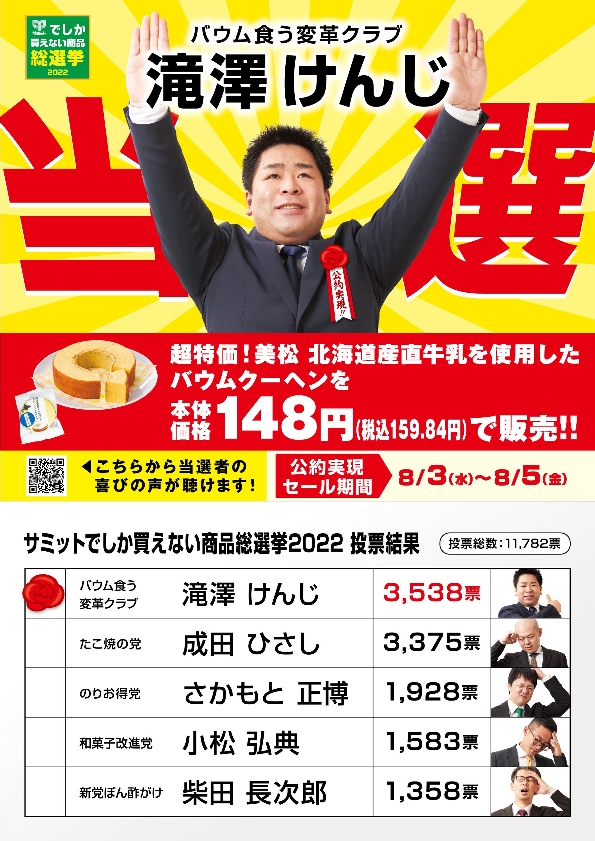 サミットでしか買えない商品総選挙を制したのは得票総数11,782票のうち3,538票を獲得した「バウム食う変革クラブ 滝澤けんじ氏」です。WEB投票での他候補者との差は僅か。店頭での得票数を足しても次位の成田氏との差は163票と、僅差での争いでした。滝澤氏の公約通り、「美松 北海道産直牛乳を使用したバウムクーヘン」を本体価格148円(税込159.84円)の超特価で販売します。
