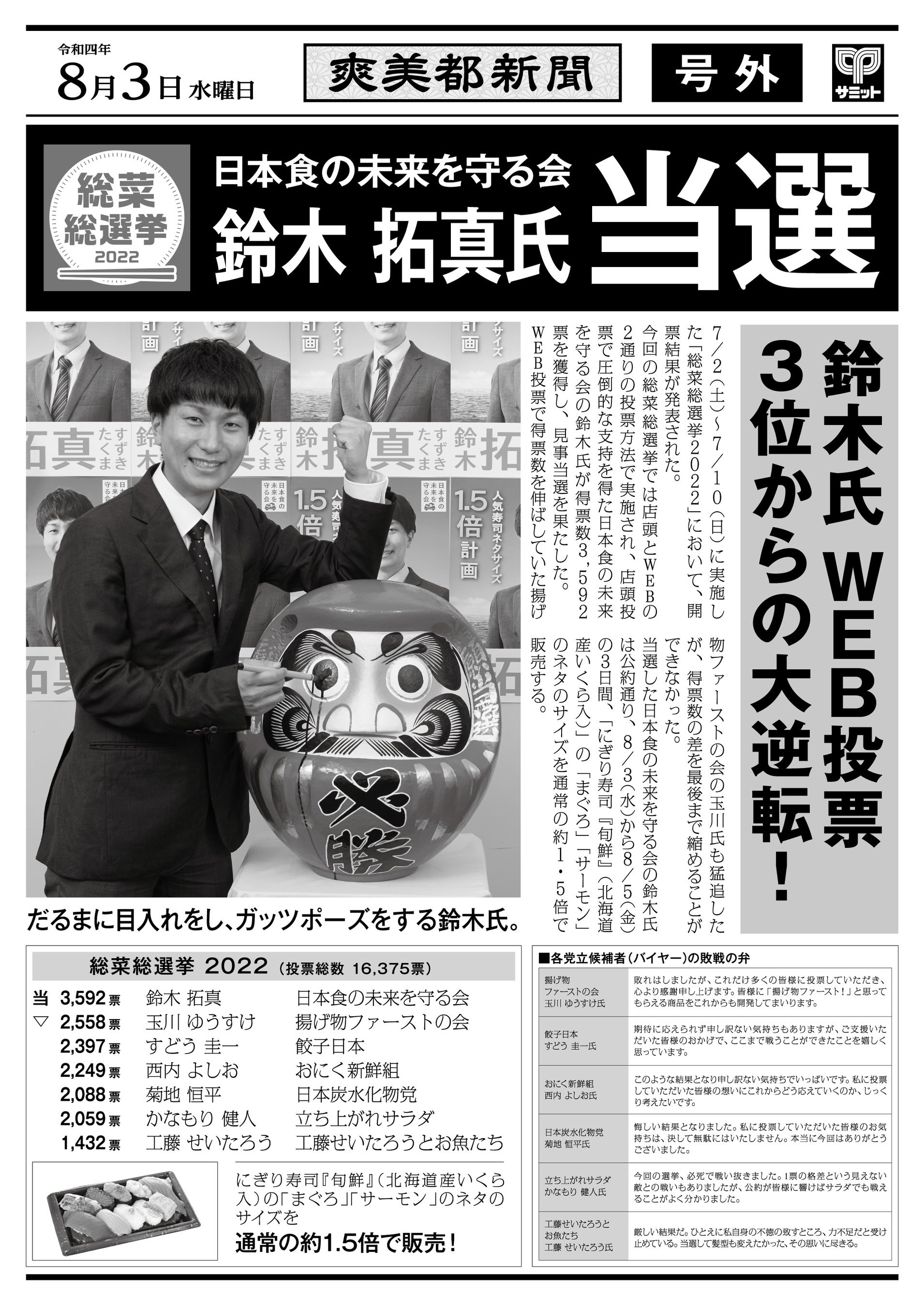 投票結果や公約実現セールの内容、喜びの声(動画)、爽美都新聞の号外は特設サイトでもご確認いただけます。