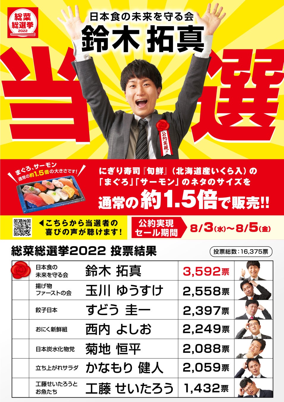 総菜総選挙を制したのは総数16,375票のうち3,592票を獲得した「日本食の未来を守る会 鈴木 拓真氏」です。事前に結果を公表していたWEB投票では3位でしたが、店頭投票で圧倒的な支持を得て、見事当選を果たしました。鈴木氏の公約通り、「にぎり寿司『旬鮮』(北海道産いくら入)」の「まぐろ」「サーモン」のネタを通常の
