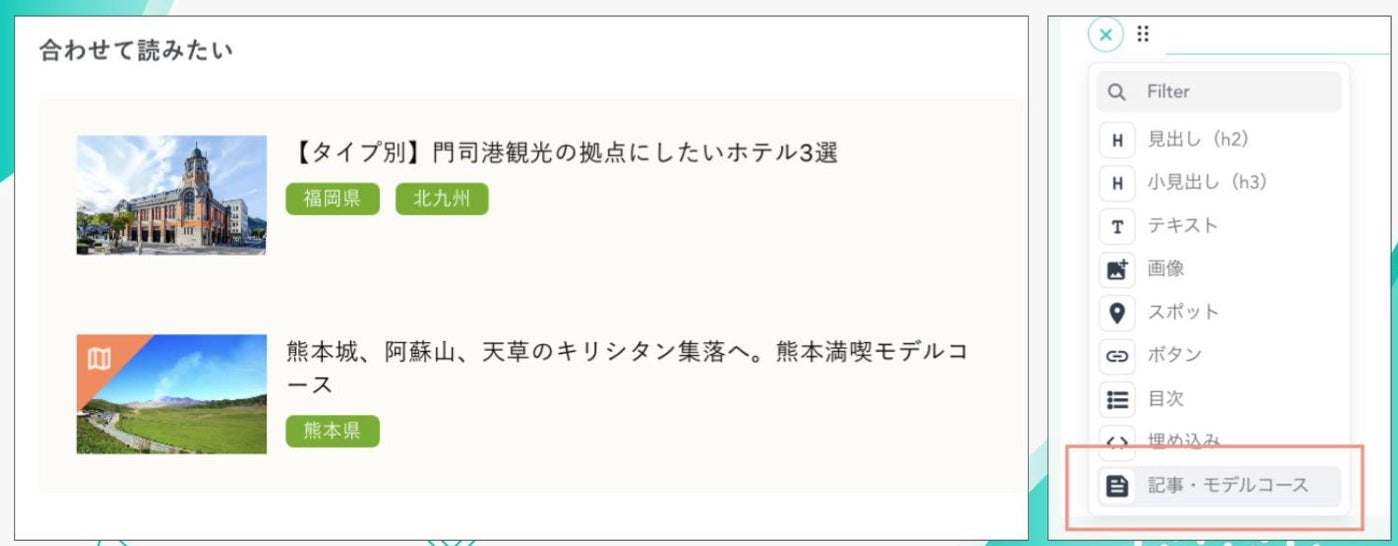 新しい記事を作成する際、関連記事を管理画面上から挿入することができるようになりました。他のおすすめスポットやモデルコースの情報をサムネイル付きで挿入することができます。