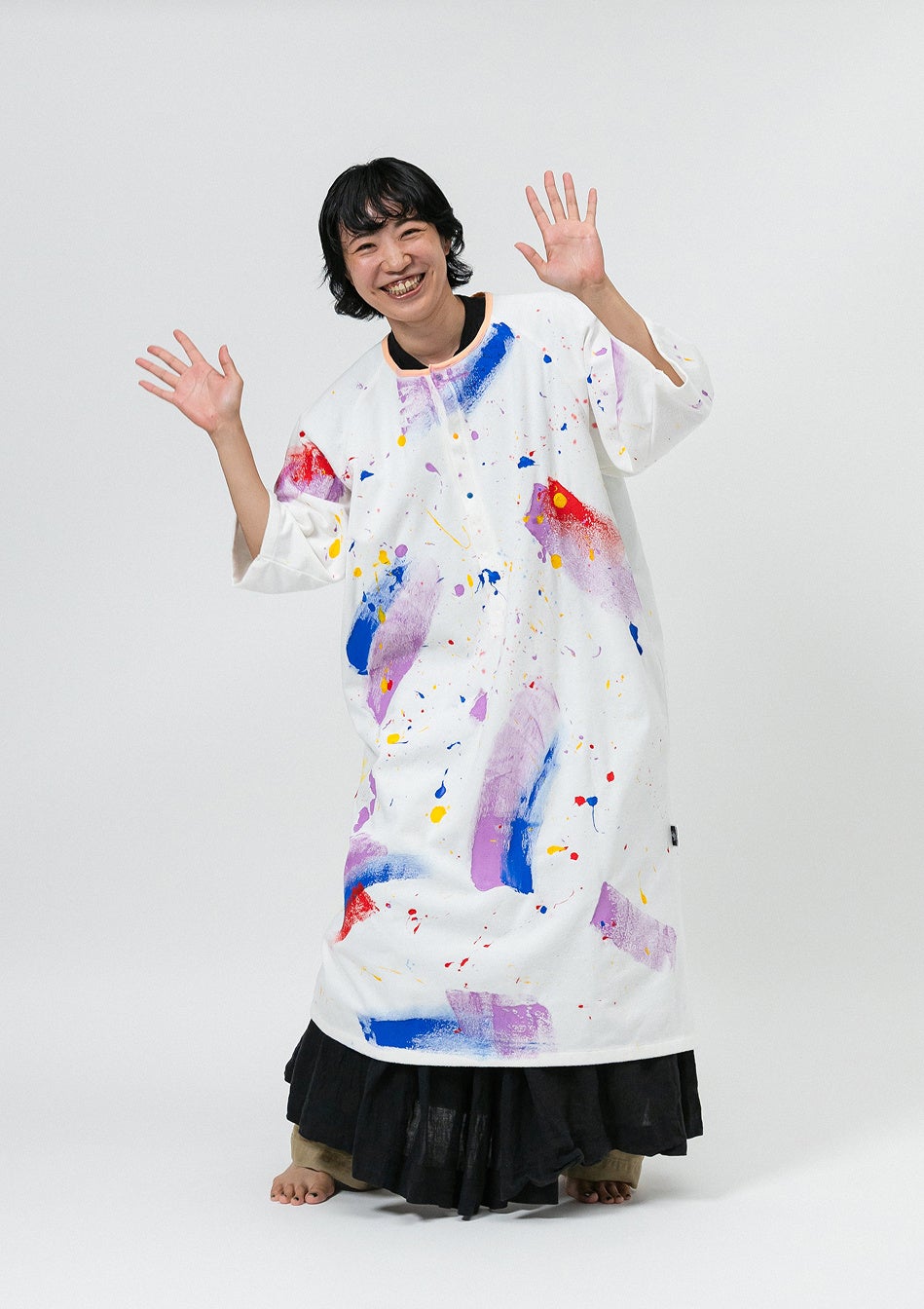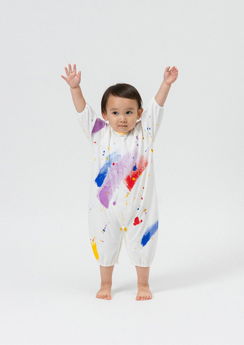 中の服を汚れから守りながら、表生地がえのぐを吸収してくれるので、えのぐの付いた手でハグしたり、親子でぺたぺた色を付け合ったり。かぞく一緒に全力でえのぐあそびを楽しめます。