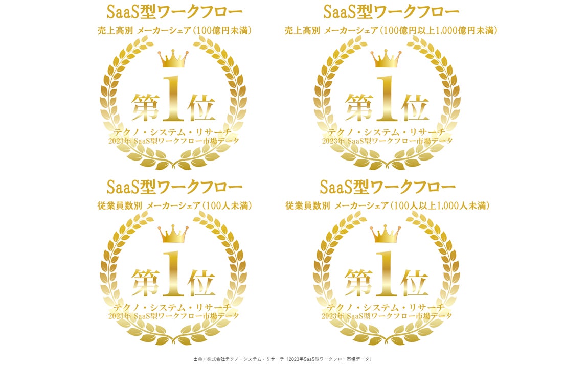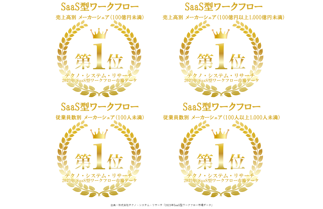 2023年のSaaS型ワークフロー市場従業員数別メーカーシェアにおいて、”100人未満”カテゴリーでシェア26.9%、”100人以上1,000人未満”カテゴリーでシェア34.1%となり、それぞれシェアNo.1を獲得しました。
