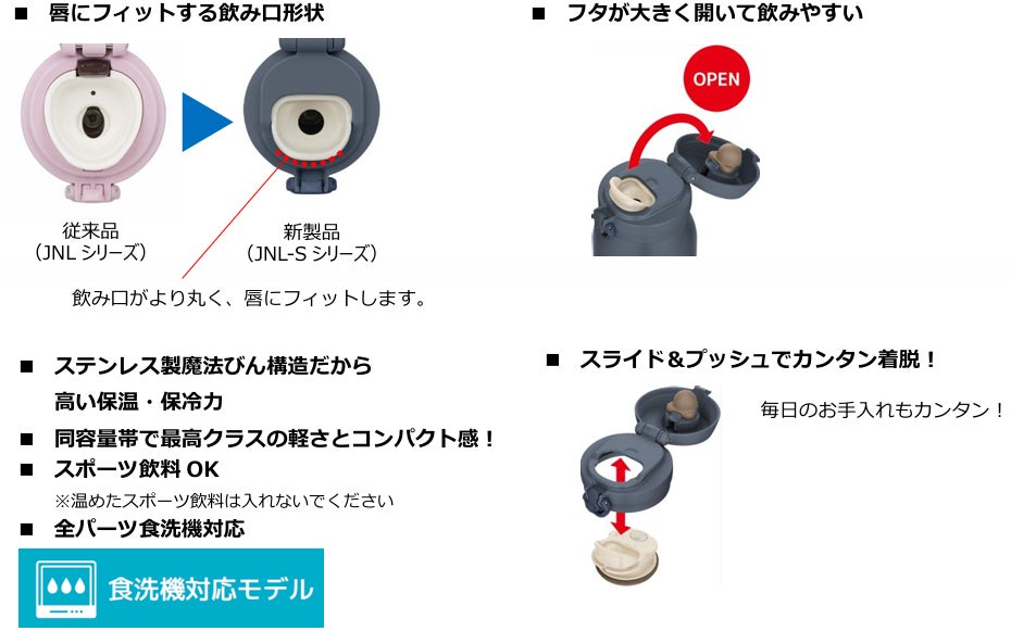 2024年に新発売した『真空断熱ケータイマグ(JNL-Sシリーズ)』は、累計出荷本数3,000万本を達成(※3)したサーモス史上最も売れた水筒『真空断熱ケータイマグ(JNLシリーズ)』をさらに飲みやすく、食洗機対応で洗いやすい仕様にリニューアルした製品です。発売以降も多くのお客様にご愛用いただいている人気シリーズです。