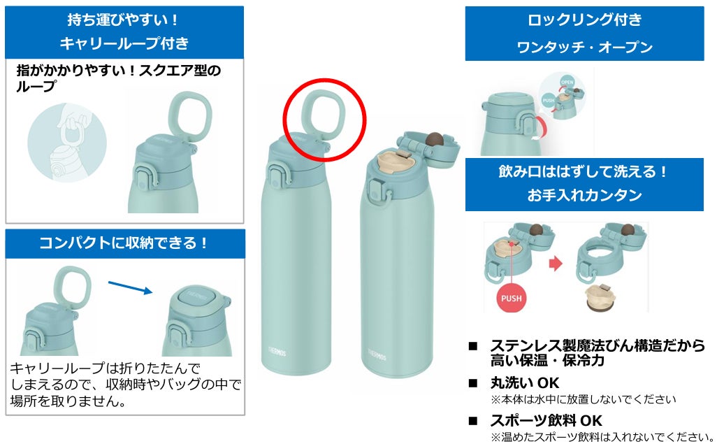 『真空断熱ケータイマグ(JOSシリーズ)』は、サーモスの定番である“ワンタッチ・オープン”タイプにキャリーループが付いた持ち運びに便利なアイテムです。このたび、同シリーズの大容量サイズを新発売します。荷物と一緒に持ち運びやすく、片手でさっと飲めるので、オフィスや学校などの日常シーンはもちろん、スポーツシーンでも活躍します。シリーズの中でも人気の高い、ダークグレーとミントブルーの2色を展開します。
