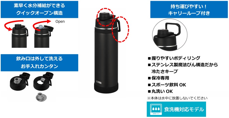 飲み口には「クイックオープン構造」を採用し、素早い水分補給が可能です。「持ち運びやすいキャリーループ」や「握りやすいボディリング」、「衝撃に強いソコカバー」を採用。さらに、食洗機にも対応し、使いやすさとお手入れのしやすさにもこだわりました。カラーは、シリーズの中でも人気の高い、ブラックとサンドの2色を展開します。