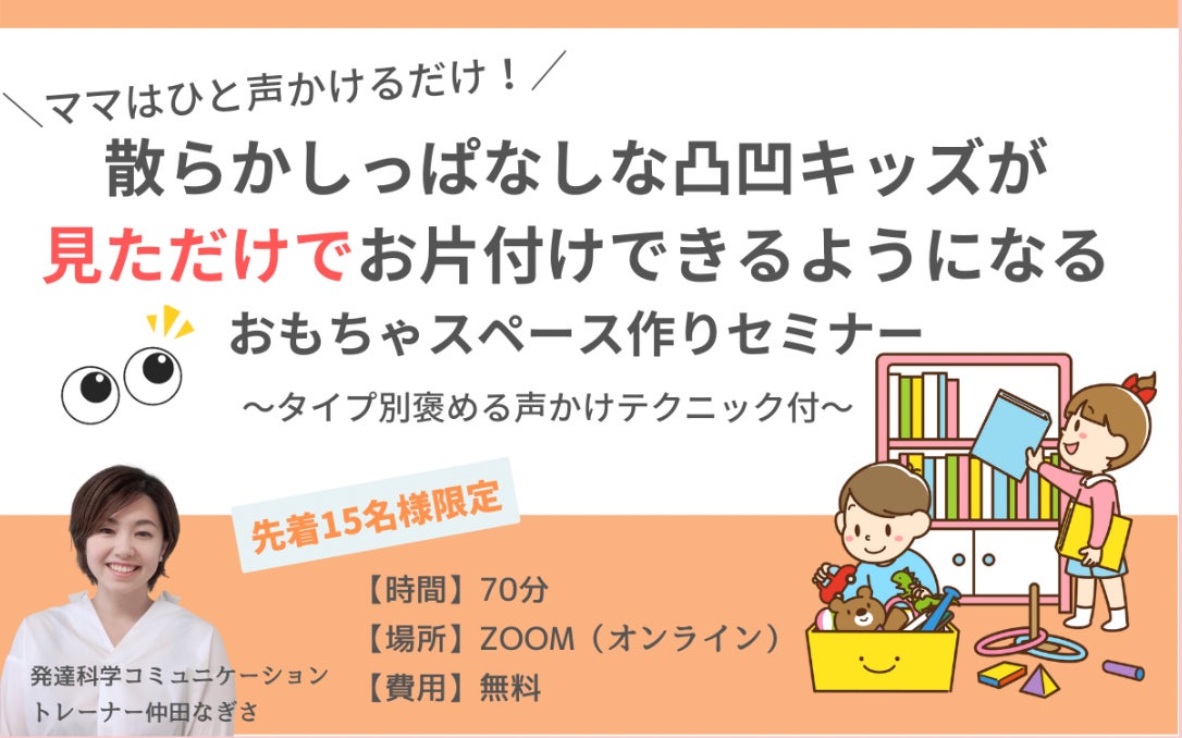 【子どもの片付けに新常識】散らかしっぱなしな発達凸凹キッズが自分から片付けできるようになるおもちゃスペース作り無料オンラインセミナー開催〜タイプ別褒める声かけテクニック付〜