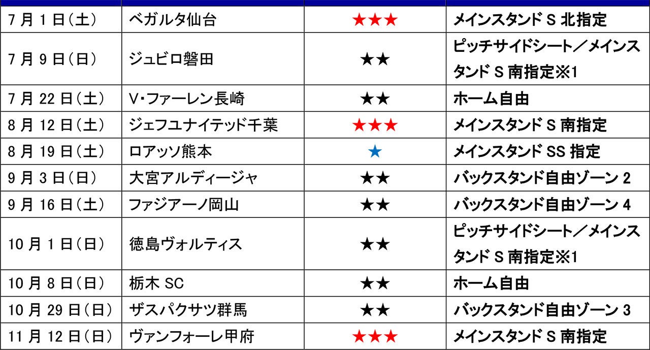 ※指定席を割り当てた試合は座席選択が可能です。ただしチケット一般販売期間の影響で、7月1日仙台戦は選べる座席を限定いたします。