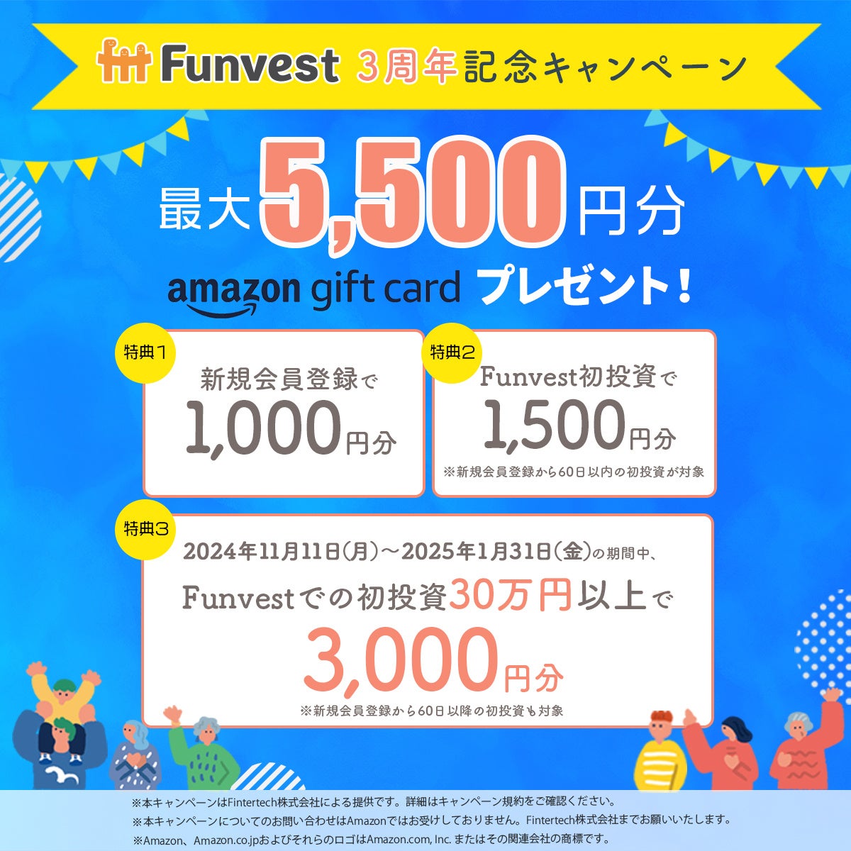 本ファンドへ出資していただいた投資家の皆様を対象として、出資額に応じて最大20,000円分のAmazonギフトカードをプレゼントするキャンペーンも併せて実施いたします。