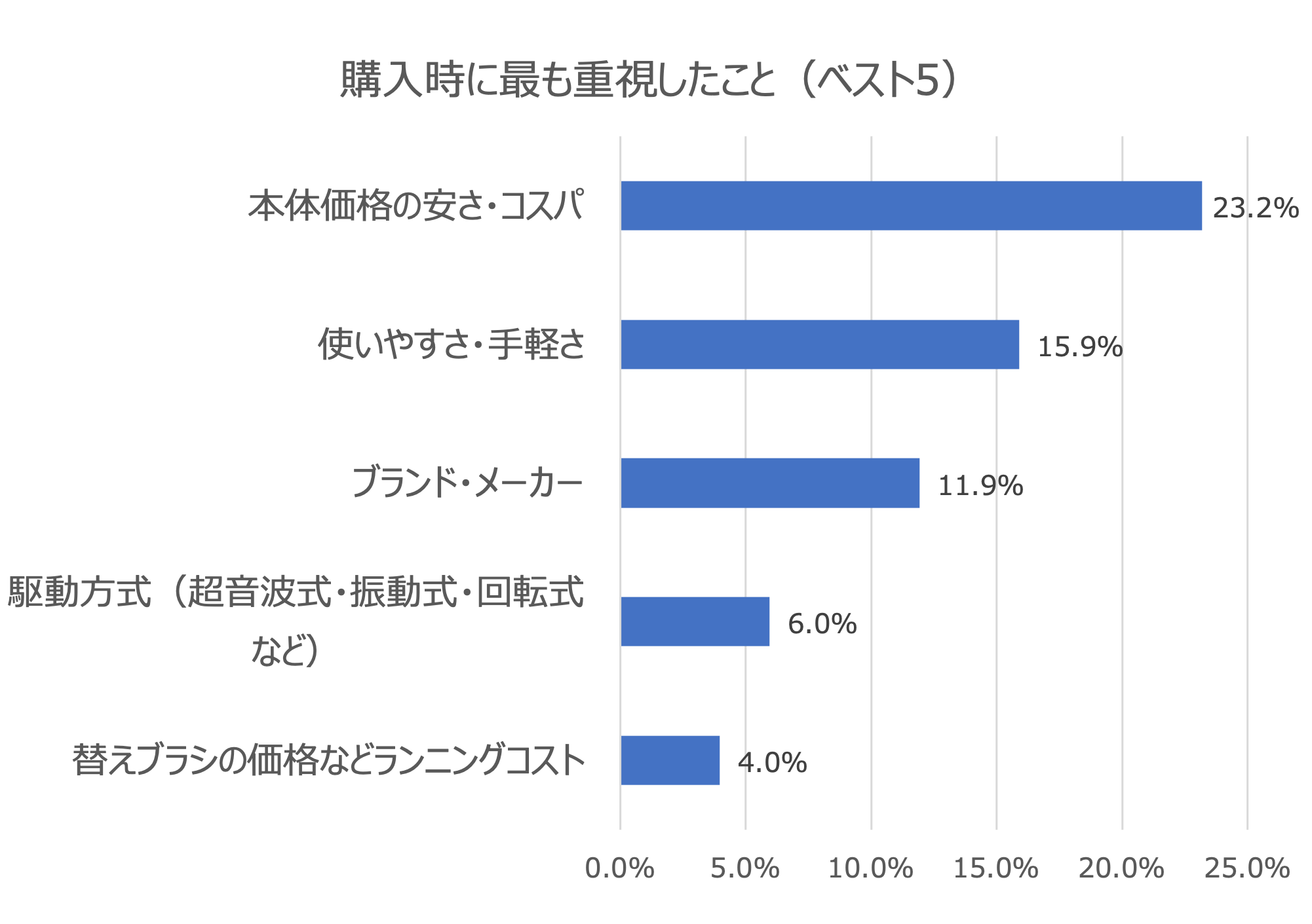 購入の際に重視したポイントは、「本体価格の安さ・コスパ」「使いやすさ・手軽さ」「ブランド・メーカー」「駆動方式」「替ブラシの価格などランニングコスト」の順となりました(上記グラフ)。