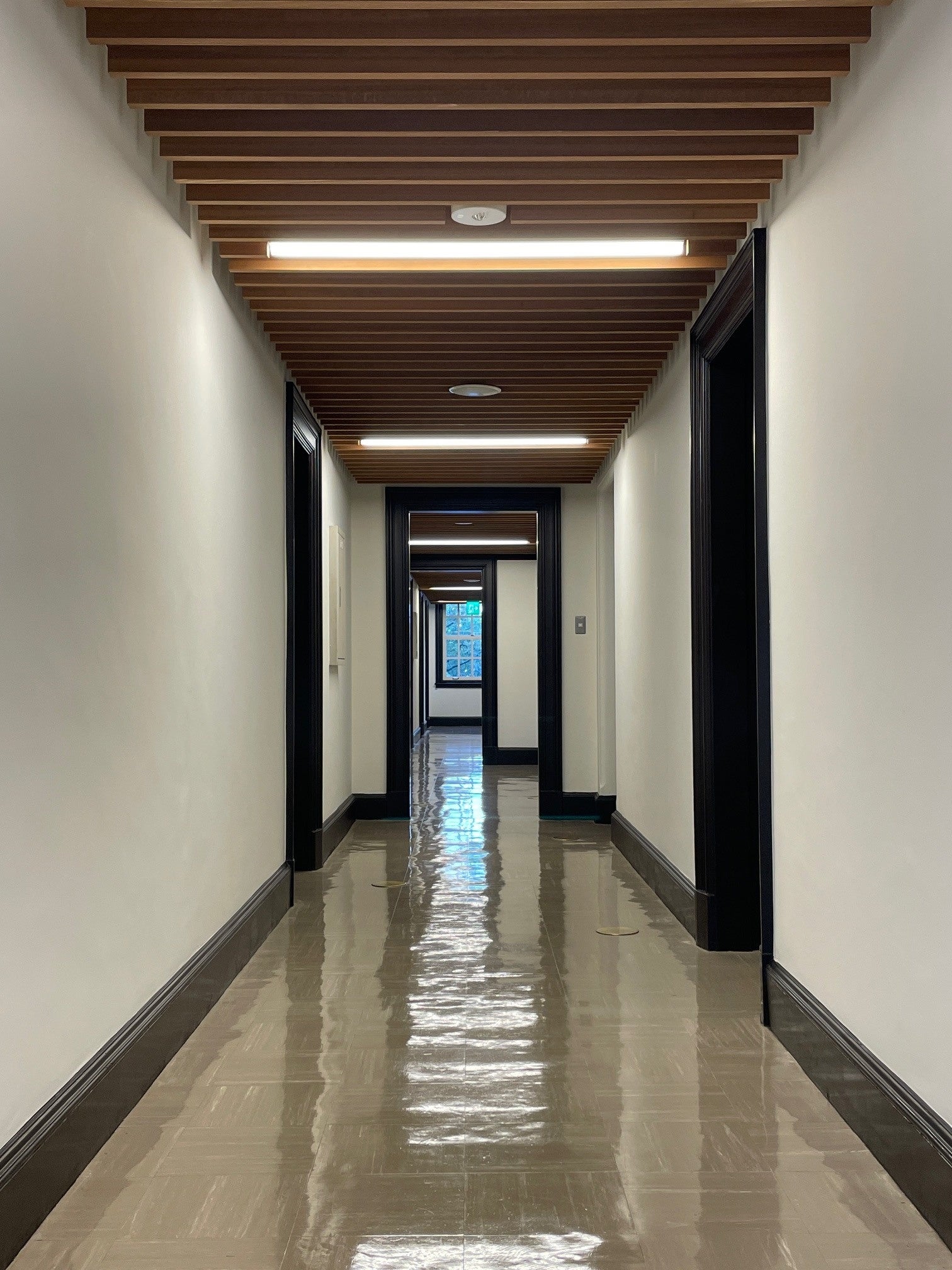 今回の整備工事では、建物に残された古い痕跡を調査する過程で、創建当時の建具(扉や窓枠)や内装の色が判明し、外観・内装ともにかつての色に復原しました。