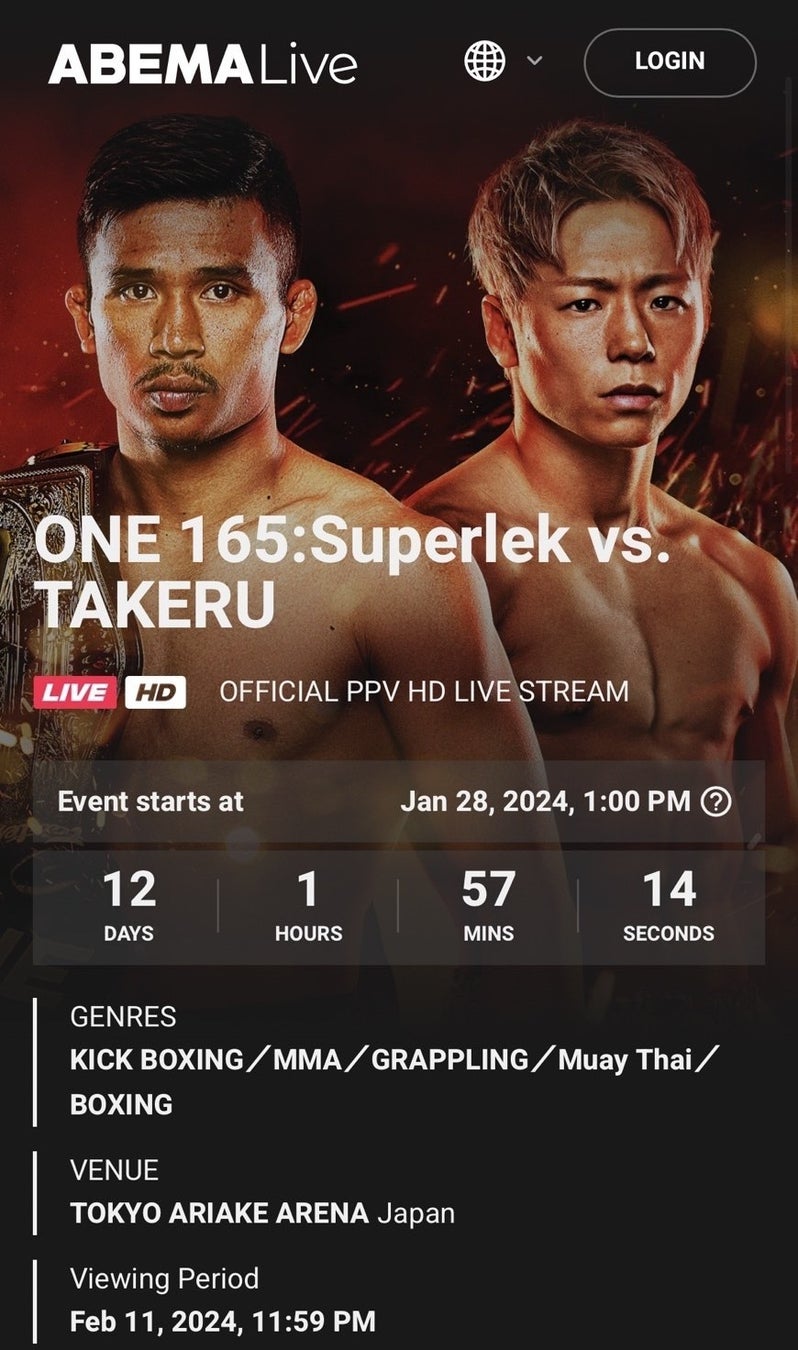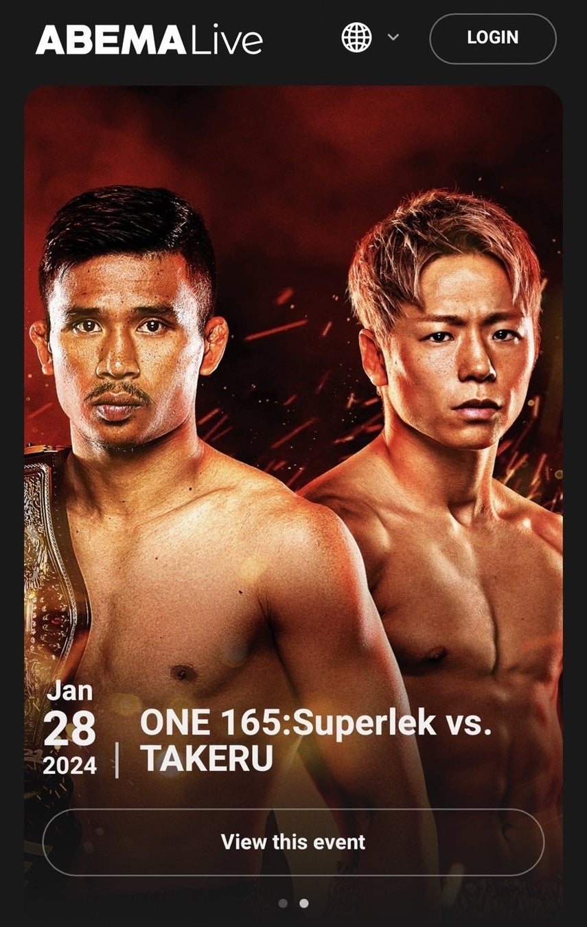 そして「ABEMA Live」の第一弾配信コンテンツとして、世界最大級の格闘技団体・ONE Championshipが2024年1月28日(日)に東京・有明アリーナで開催する『ONE 165: スーパーレックvs. 武尊』を、タイ、フィリピン、韓国の3か国において日本と同時生中継することを決定いたしました。約4年ぶりに日本で開催される本大会のメインイベントでは、ONEフライ級ムエタイ世界王者のロッタン・ジットムアンノン選手とISKA世界ライト級王者・K-1世界三階級制覇王者の武尊選手の対戦が予定されており、長らくファンの中でも熱望されていたビッグマッチがついに実現するはずでしたが、今年1月5日(金)にONEがロッタン選手の怪我による大会欠場を公式に発表。代わりに、ONEフライ級キックボクシング世界王者のスーパーレック・キャットムーカオ選手との3分5ラウンドの