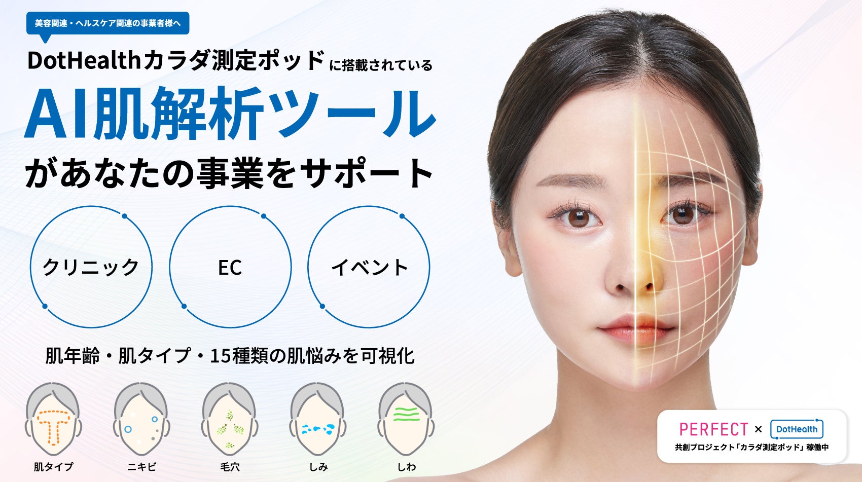 パーフェクト社は、「DotHealthカラダ測定サービス」へ、高精度なAI肌解析ツールを提供しています。