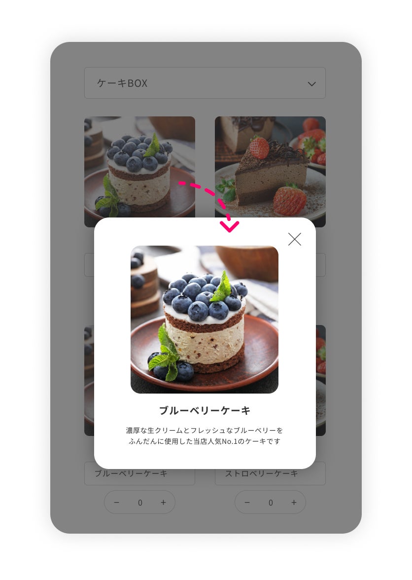 商品画像をクリックすると、事前に登録した商品説明文がモーダルにて表示されます。