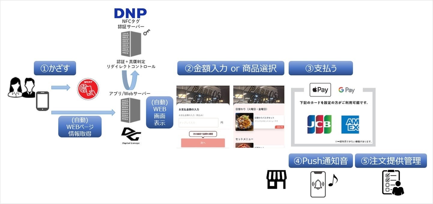 また、本サービスではDNPの「DNP NFCタグ認証プラットフォーム」*2を利用し、タグの複製、URL情報の改ざんや二次使用等による偽造防止と不正使用防止を実現しているため、ユーザーは安心して自身のスマートフォンでの決済を利用できます。