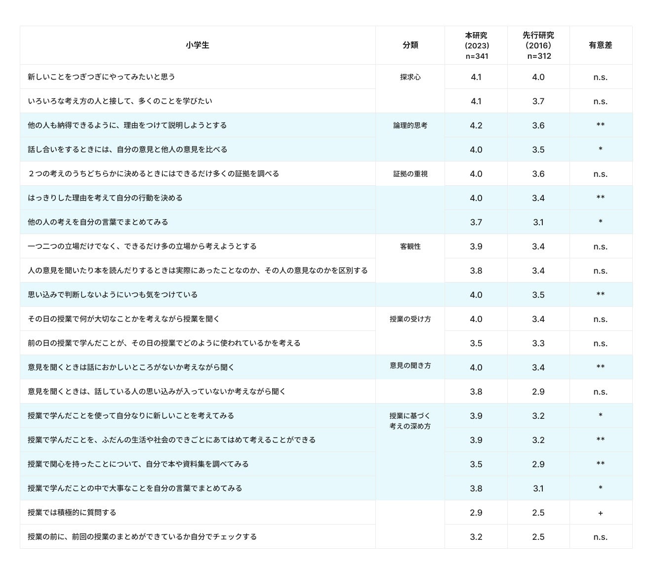 性差は比較的小さい結果となりました。また、2019年に当社が実施した同様の調査との比較では、2023年の児童の方が多くの項目で批判的思考態度が高い傾向と確認されました。こうした変化が教育の影響によるものか、社会環境の変化によるものかは本研究だけでは断定できませんが、児童の思考態度に変化が生じている可能性が示されました。