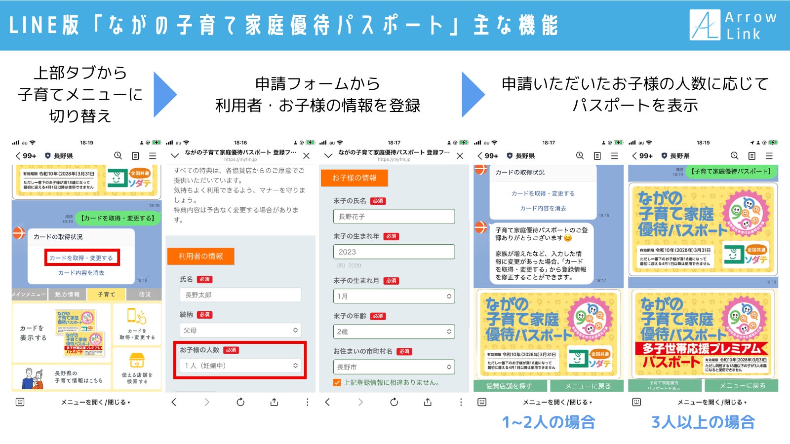 この度、株式会社アローリンク(本社:兵庫県神戸市中央区雲井通4-2-2 マークラー神戸ビル4階、代表取締役:蓬莱和真)は、長野県(知事:阿部 守一)が拡張ツール「Liny」を活用し、長野県LINE公式アカウントにて県内の子育て世帯向けの「ながの子育て家庭優待パスポート」を新たに導入し、運用を開始しました。