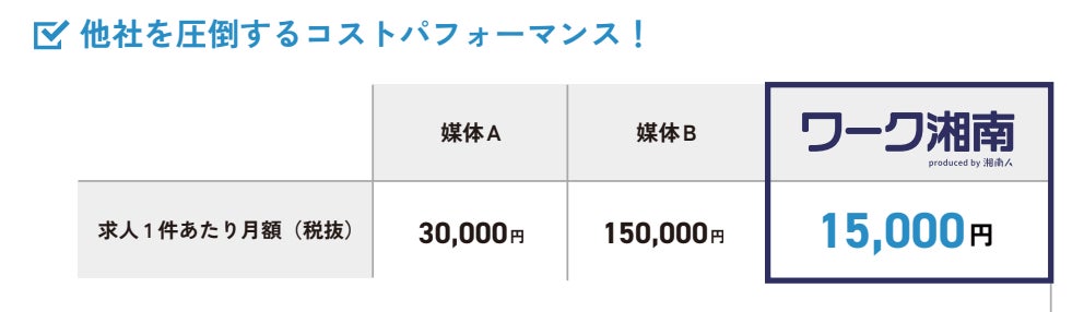 1)他社媒体と比較し掲載料が安価であること(求人を何件載せても、1社あたりの掲載料は15,000円!)