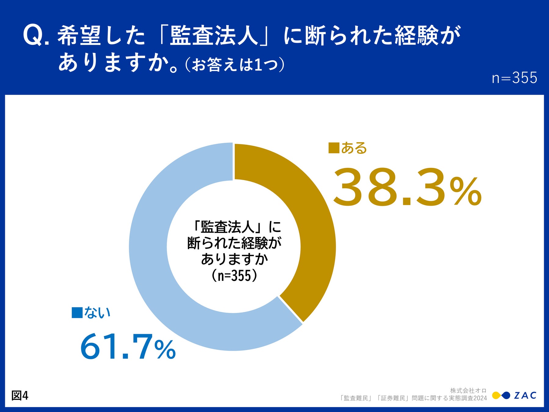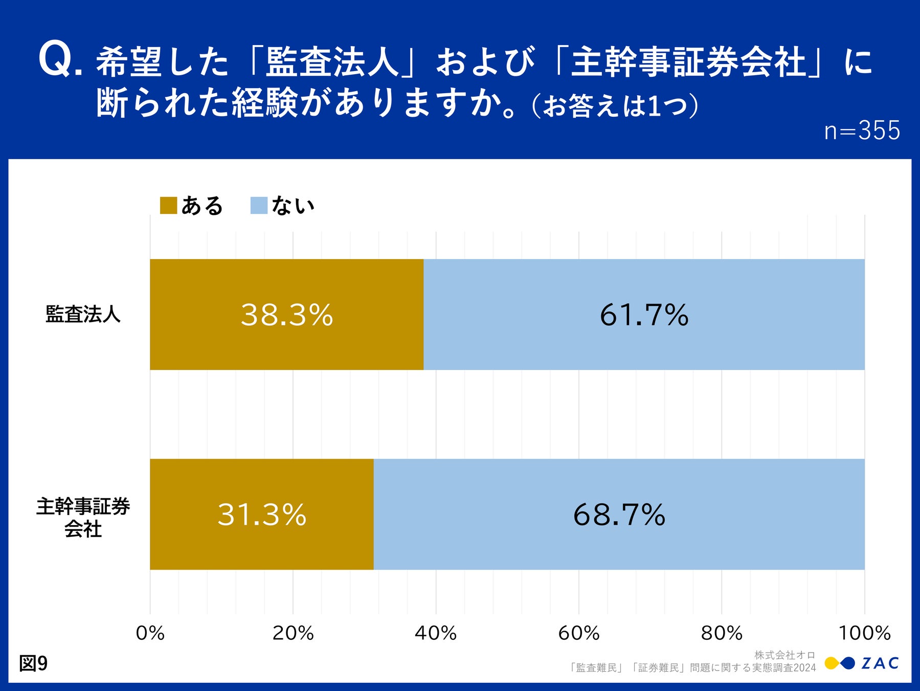 株式会社オロ(本社:東京都目黒区、代表取締役社⻑執行役員:川田 篤 以下、オロ)は、株式上場を目指すN-3期~N期の経営者・役員355名に対して「監査難民」「証券難民」問題に関する実態調査を実施いたしましたので、ご報告いたします。本調査は2022年7月から隔年で実施しており、前回調査(「監査難民問題2022」 https://prtimes.jp/main/html/rd/p/000000104.000075257.html 「証券難民問題2022」https://prtimes.jp/main/html/rd/p/000000107.000075257.html )との比較分析も行っています。