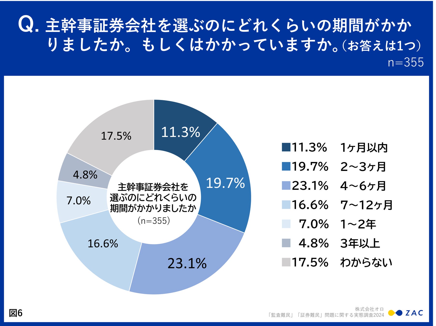主幹事証券会社の確保にどのくらいの期間がかかったか(かかっているか)を尋ねたところ、「4~6ヶ月」が最も多く、23.1%(前回調査21.6%)。続いて「2~3ヶ月」が19.7%(前回調査21.8%)という結果になりました。(図6)