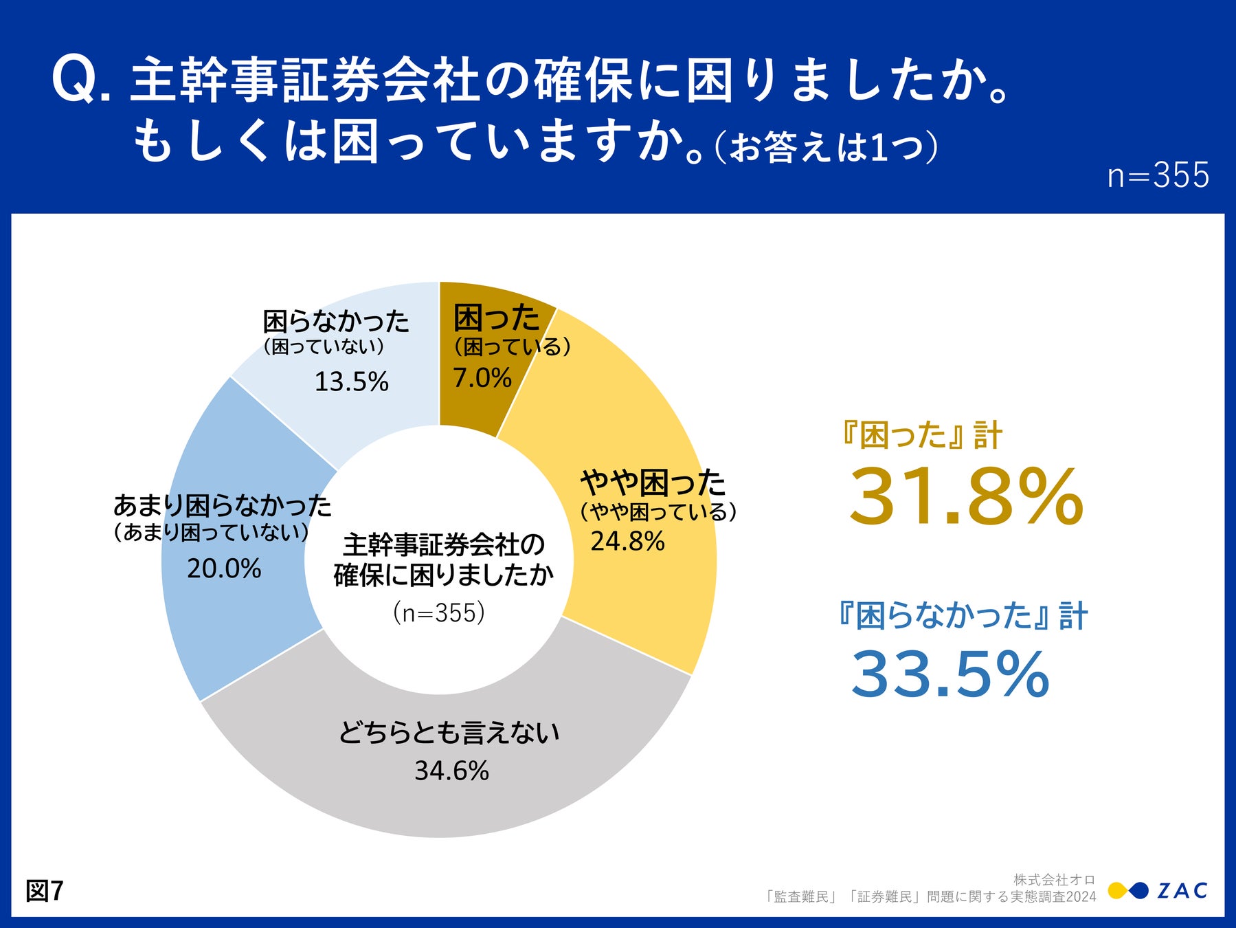 主幹事証券会社の確保に困ったか(困っているか)を聞いたところ、「困った(困っている)」「やや困った(やや困っている)」が計31.8%、「あまり困らなかった(あまり困っていない)」「困らなかった(困っていない)」が計33.5%という結果になっています。(図7)
