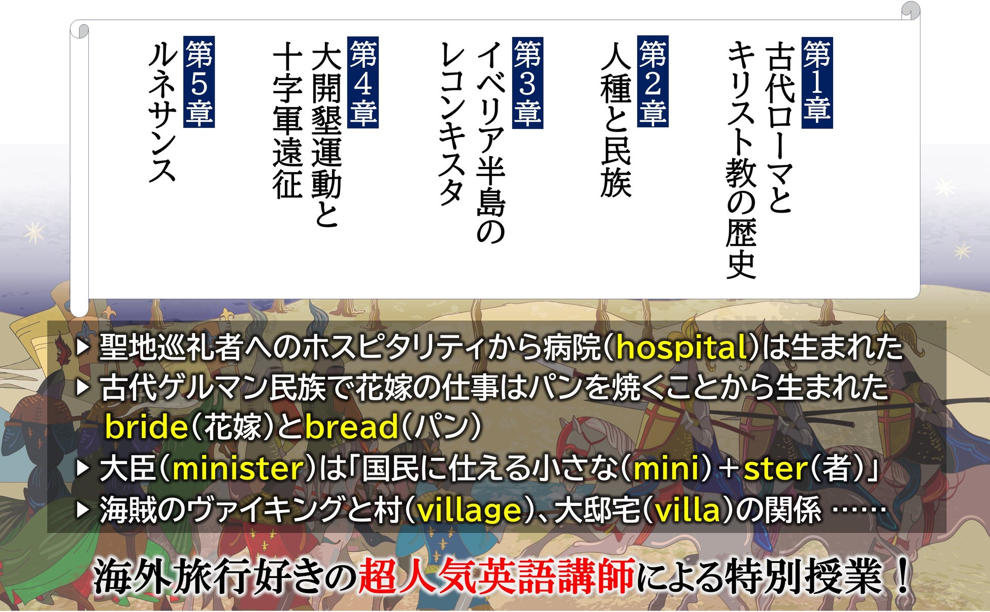 本書では、ヨーロッパの歴史を楽しく学びながら英単語の語彙力を高めることができます。世界史の教科書では取り上げられない興味深い裏話や、一度聞いたら人に話したくなるような目からウロコ的な豆知識をふんだんに盛り込みました。