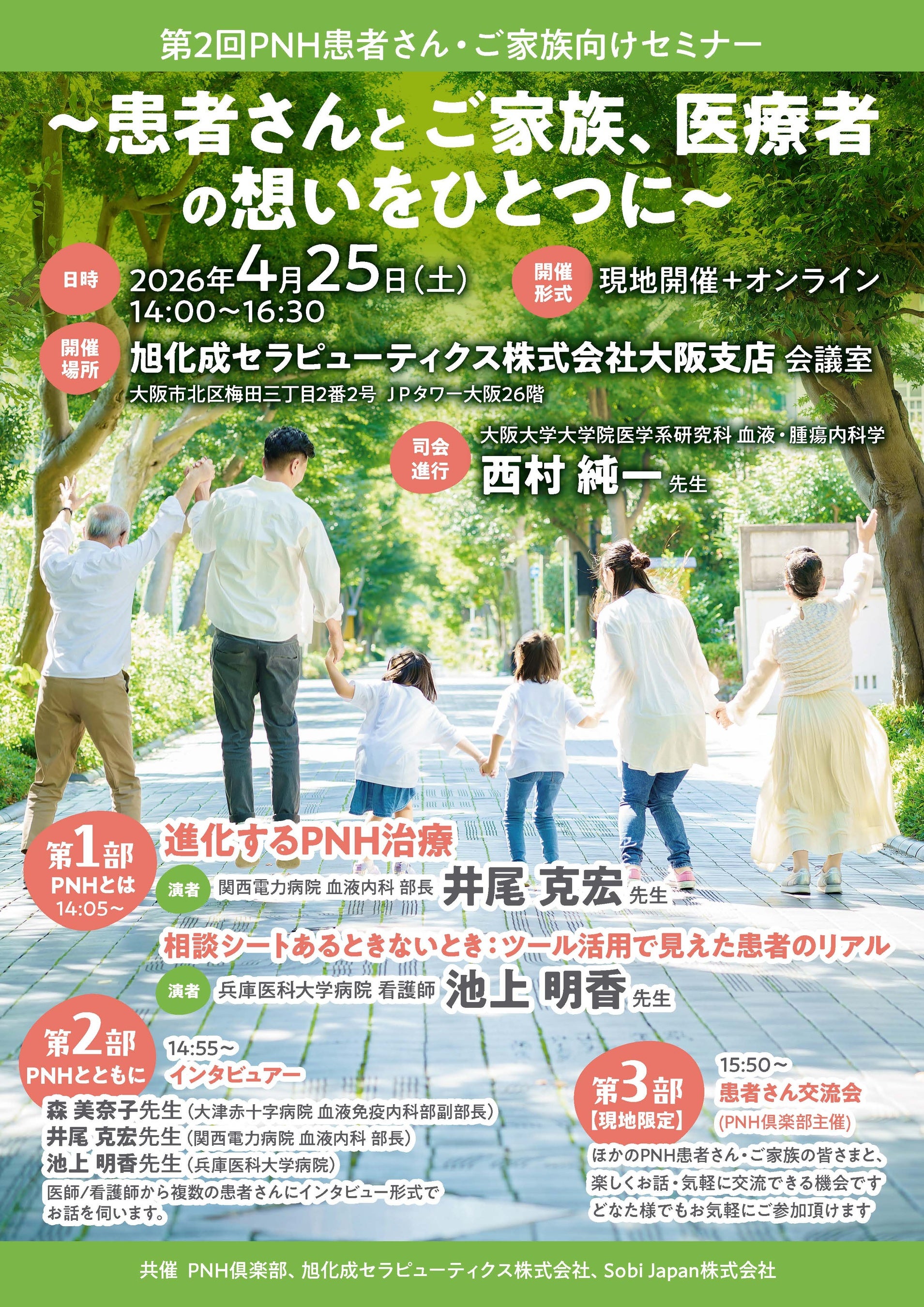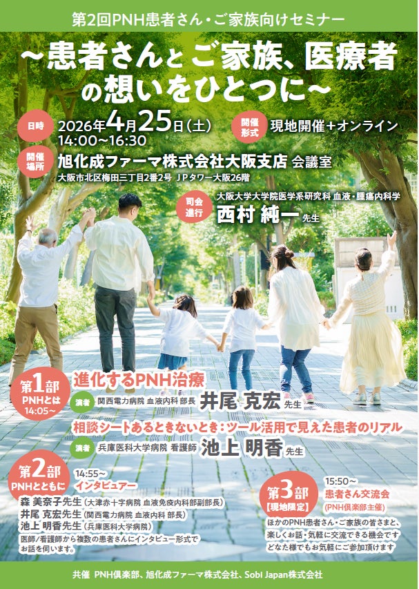 旭化成ファーマは、2026年4月25日(土)に「第2回PNH患者さん・ご家族向けセミナー」を開催いたしますので、お知らせします。
