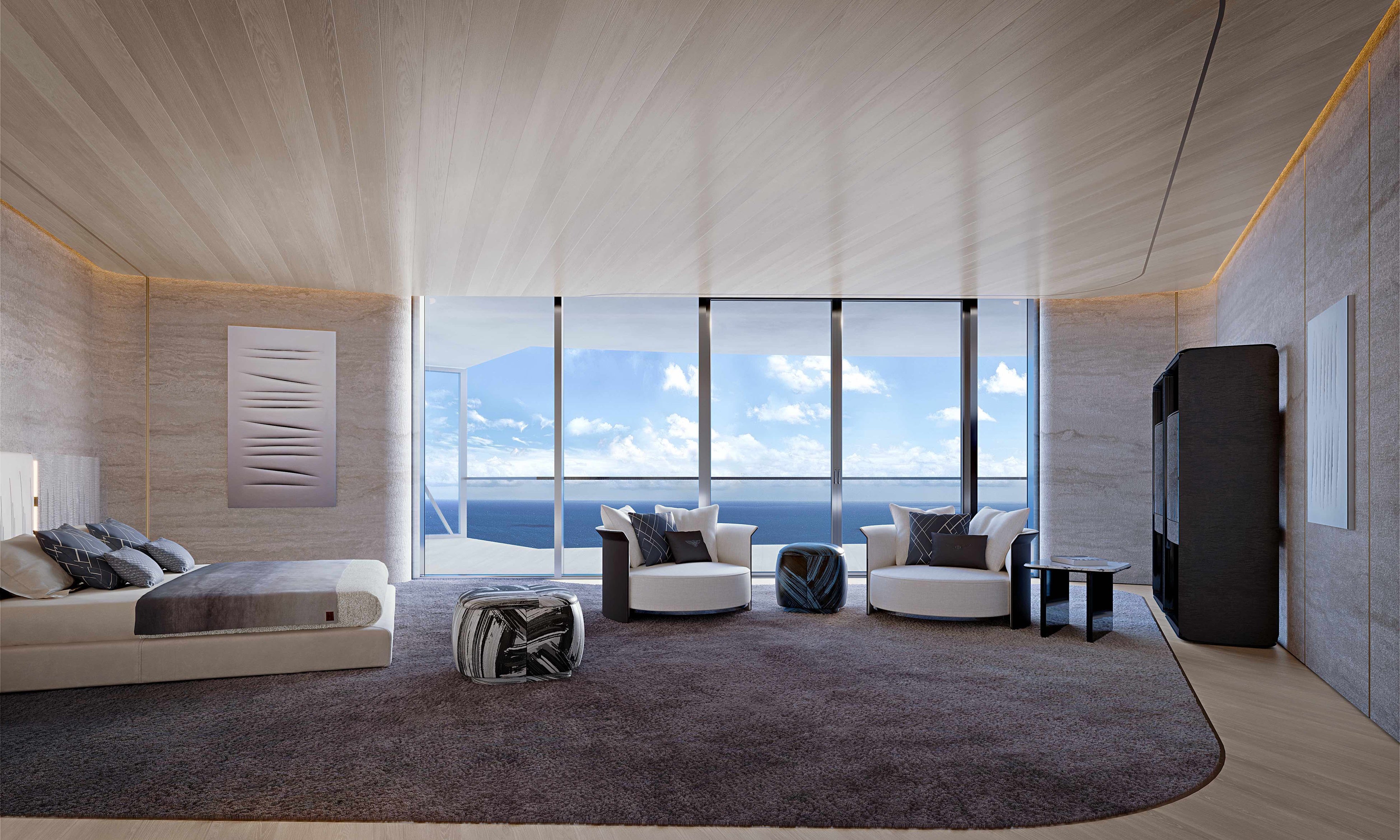 また、ベントレーホームは、このペントハウスのために、ビーチに調和する素材を使用した、オプションのインテリアコンセプトを提案いたします。天井の高い快適な居住空間と複数の寝室・バスルームにより、家族や来客をもてなすにも理想的な住まいとなっています。