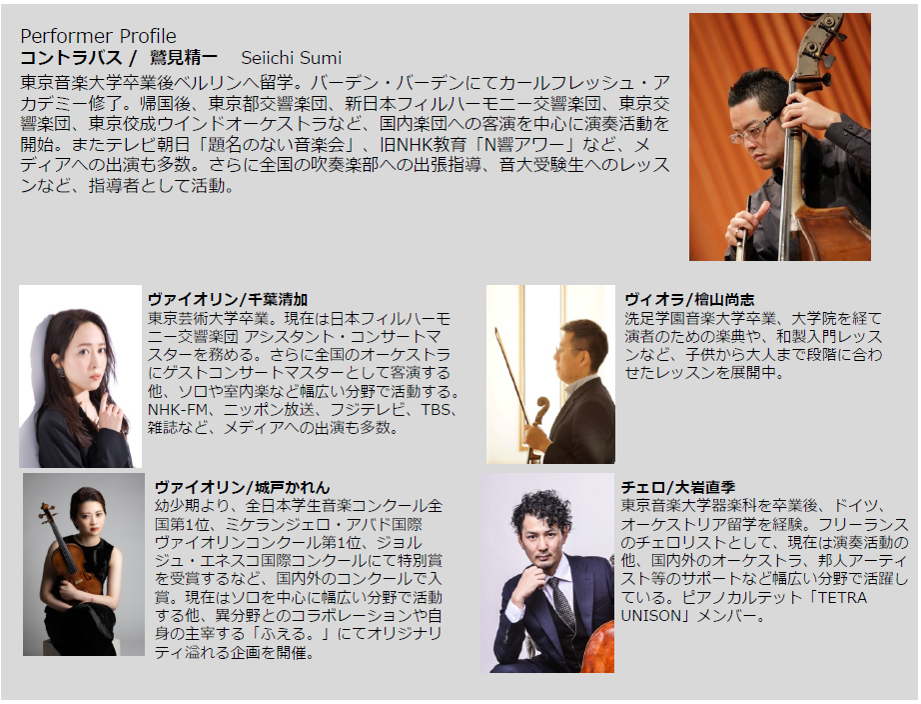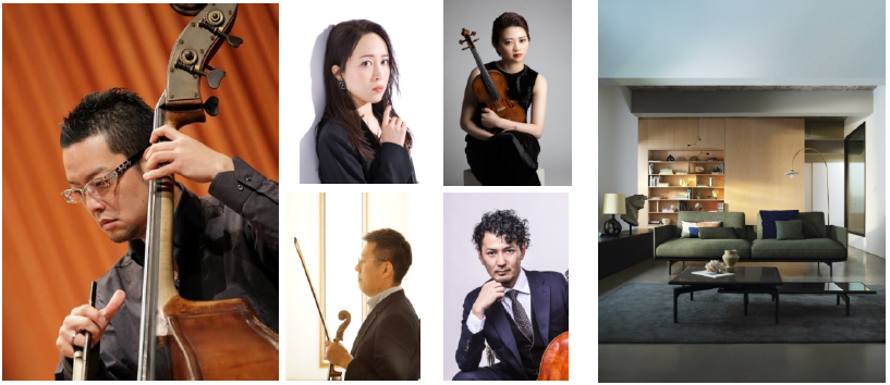 この度のスペシャルコンサートでは、ドイツのクラフトマンシップが息づく高いクオリティ、そして類稀な掛け心地で高い評価を得るドイツを代表するブランド「ロルフベンツ」の家具で寛ぎながら、クラシック音楽の文化を築いたドイツで誕生した名曲の数々をお楽しみいただけます。演奏には、世界中で活躍するドイツ出身のコントラバス奏者鷲⾒精⼀⽒率いる、弦楽奏者5名が登場し、コントラバス・ヴァイオリン・ヴィオラ・チェロの四重奏で⼀夜限りの美しい旋律を奏でます。