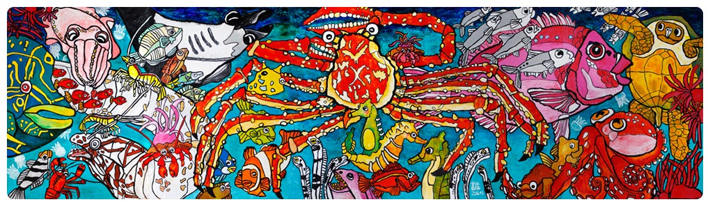 ここに持ってきた一番大きな作品「海の中のなかまたち」は、本物のタカアシガニを手で持った時の硬い甲羅の感触が印象に残っていたことから描き始めた作品です。真ん中の大きなタカアシガニの周りで、海の中のなかまたちが遊んでいる様子を思い浮かべながら描きました。ここにいらっしゃる皆さんと同じで、私も海の中の生きものが大好きです。