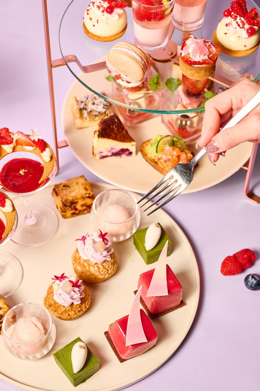 古都京都の茶文化に通じる、ゆったりとした時の流れに浸る贅沢なアフタヌーンティー。主役のいちごに、クランベリーやカシス、ブルーベリーなど多彩なベリーを重ね、京都らしい抹茶の彩りを添えて、可憐で上品な世界観を表現しました。