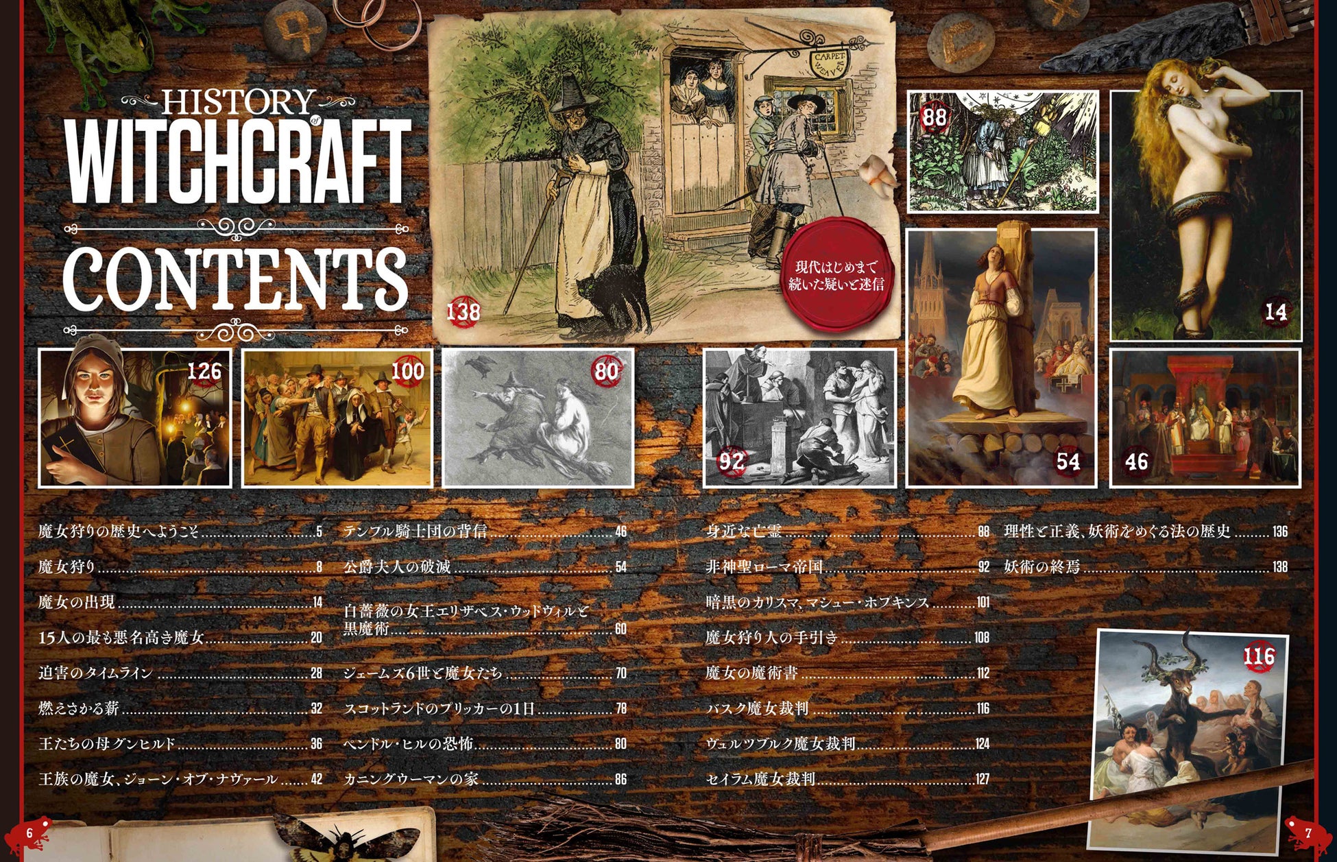 魔女狩りの歴史へようこそ/魔女狩り/魔女の出現/15人の最も悪名高き魔女/迫害のタイムライン/燃えさかる薪/王たちの母グンヒルド/王族の魔女、ジョーン・オブ・ナヴァール/テンプル騎士団の背信/公爵夫人の破滅/白薔薇の女王エリザベス・ウッドヴィルと黒魔術など