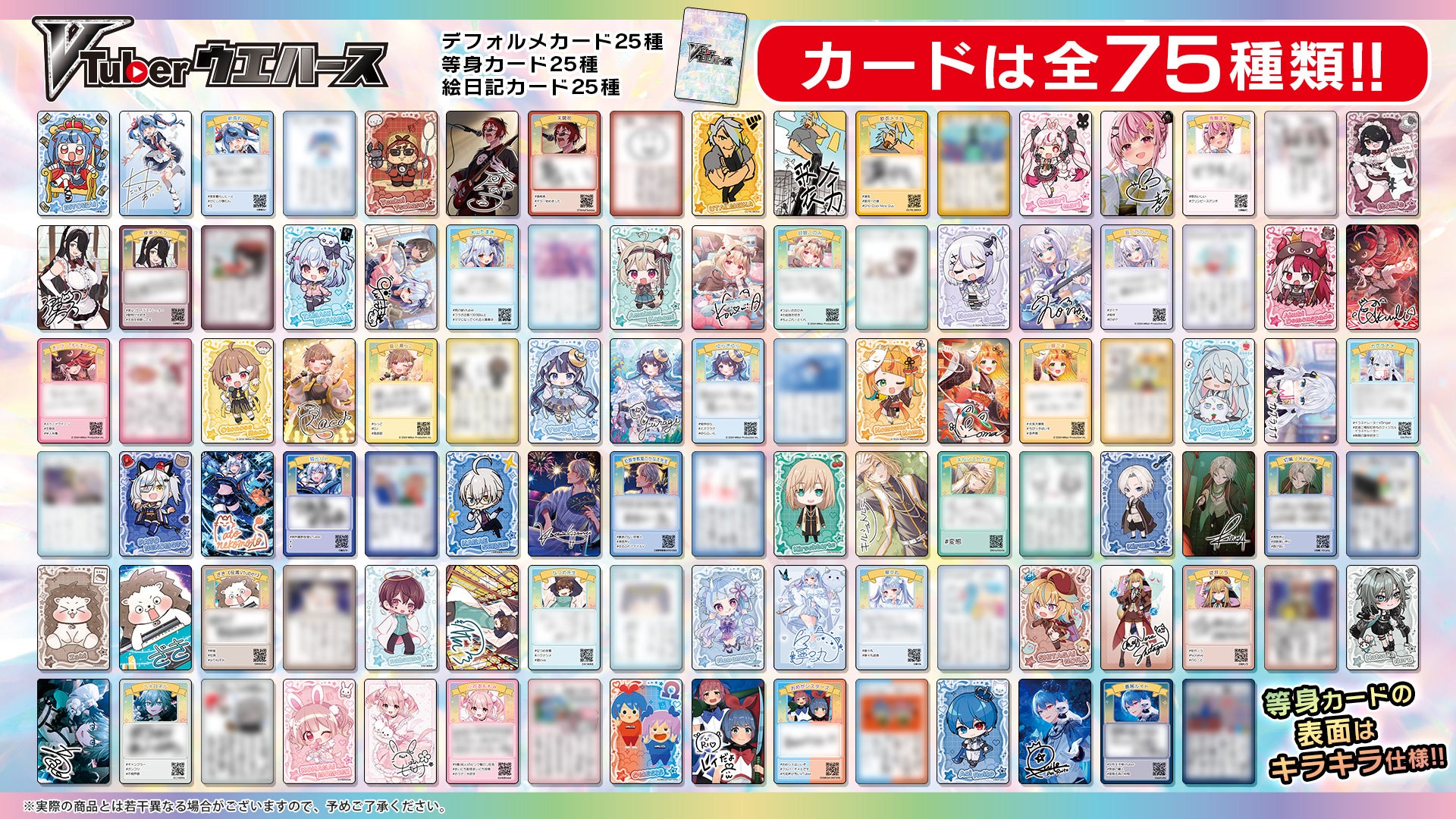 人気VTuber25組のイラストを使用したオリジナルカード(全75種類)のうち、いずれか1枚がランダムで付属しています。カードのラインナップは、描き下ろしイラストを使用した複製サイン入りレアカード25種、デフォルメカード25種、ライバーの複製直筆絵日記風カード25種で構成されております。