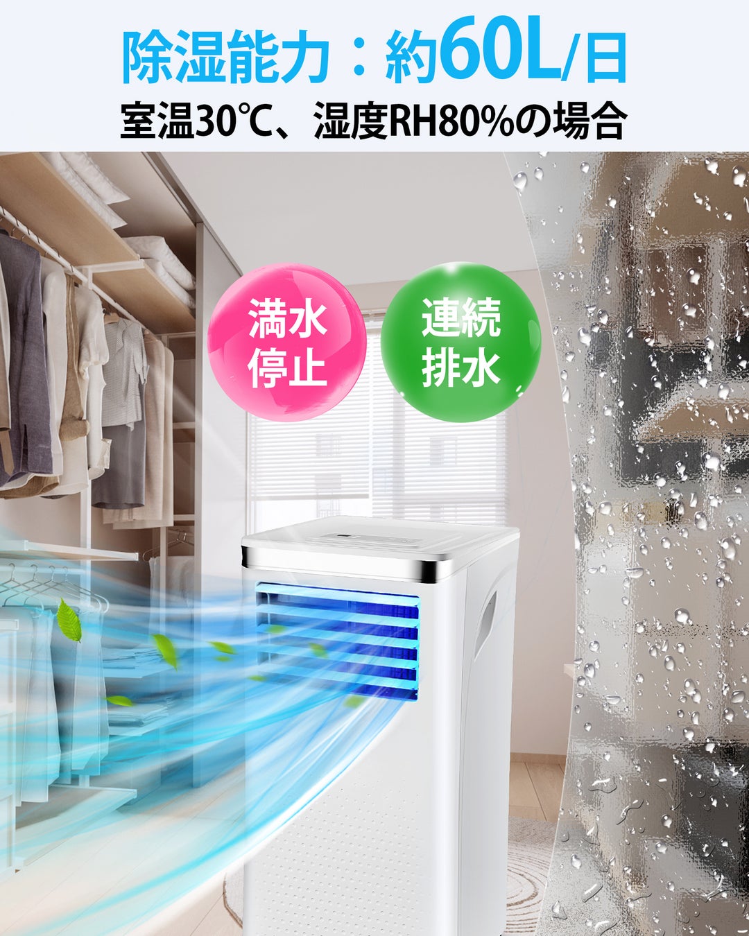 · 【一台三役で大活躍】冷房に加えて、除湿・送風(換気)機能も搭載。除湿量60L/日(室温30℃,湿度RH80%の場合)で湿度が高くて蒸し暑い日や、雨が多く洗濯物を部屋に干す機会が増える梅雨時期に超強力な除湿機として利用できます。また、送風機能を搭載したので、室内の換気も手軽に行えます。